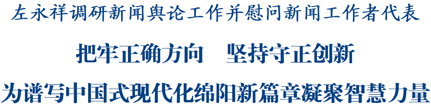 調(diào)研中,左永祥代表市委、市政府向全市廣大新聞工作者致以節(jié)日問候,向大家長期以來的辛勤付出表示感謝,對全市新聞輿論工作取得的成績給予肯定,并宣講黨的二十屆四中全會精神。他指出,學(xué)習(xí)宣傳貫徹黨的二十屆四中全會精神,是全市上下當(dāng)前和今后一個時期的重要政治任務(wù),要精心組織傳達學(xué)習(xí),廣泛開展宣傳宣講,著力營造濃厚氛圍。面對新形勢新任務(wù),新聞媒體要站在鞏固黨的執(zhí)政基礎(chǔ)、維護意識形態(tài)安全、服務(wù)綿陽發(fā)展大局的高度,在譜寫中國式現(xiàn)代化綿陽新篇章進程中展現(xiàn)新?lián)?dāng)新作為。要堅持黨媒姓黨,自覺把擁護“兩個確立”、做到“兩個維護”落實到新聞輿論工作的各方面全過程,加強思想政治建設(shè),增強政治敏銳性和政治鑒別力,堅決守好意識形態(tài)陣地,研究好闡釋好傳播好新時代黨的創(chuàng)新理論,確保新聞輿論工作始終沿著正確方向前進。要圍繞全市中心工作,把鏡頭和筆觸聚焦到推動高質(zhì)量發(fā)展生動實踐和群眾關(guān)切的民生實事上來,創(chuàng)作更多貼近時代、貼近群眾、貼近生活的精品力作,講好綿陽故事、傳播綿陽聲音、展示綿陽形象,鞏固壯大全市上下奮進新時代的主流思想輿論。要銳意改革創(chuàng)新,創(chuàng)新數(shù)字時代新聞傳播手段、方式和載體,積極拓展“新聞+”發(fā)展模式,走好新聞媒體賦能文旅深度融合發(fā)展路徑,激發(fā)媒體轉(zhuǎn)型的“內(nèi)生動力”。要強化人才引領(lǐng),加強班子隊伍建設(shè)和人才工作,健全新聞宣傳人才培養(yǎng)、使用、激勵等機制,提升專業(yè)素養(yǎng)能力,著力打造一支政治堅定、業(yè)務(wù)精湛、作風(fēng)優(yōu)良的新聞輿論工作隊伍。