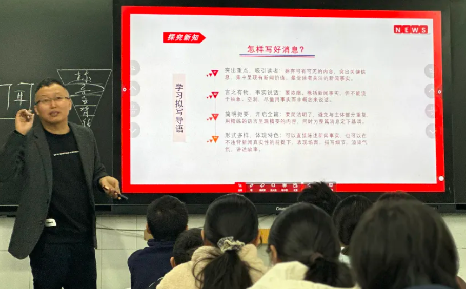 趙亮老師在八年級三班呈現(xiàn)了一堂結(jié)構(gòu)嚴謹、內(nèi)容充實的《新聞寫作》示范課。課堂環(huán)節(jié)緊湊,知識點層層遞進,學(xué)生積極參與討論,踴躍回答問題?,F(xiàn)場采訪聽課教師環(huán)節(jié)氣氛熱烈而有序,學(xué)生新聞寫作成果豐富多樣,佳作頻出,充分體現(xiàn)了學(xué)以致用的教學(xué)效果。
