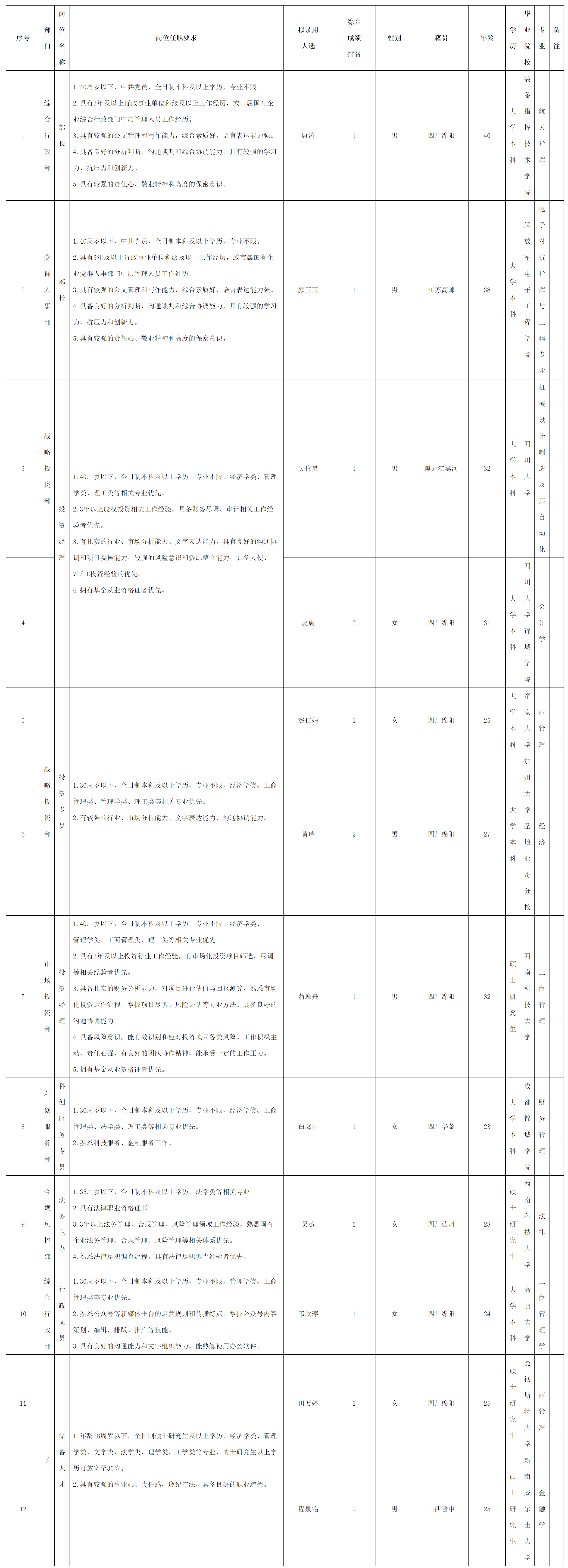 根據(jù)綿陽科技城科技創(chuàng)新投資有限公司發(fā)布的第三批中層管理人員及員工招聘公告和招聘相關(guān)規(guī)定,經(jīng)筆試、面試、考察、體檢等程序,擬錄用唐濤、顏玉玉等12位同志到綿陽科技城科技創(chuàng)新投資有限公司工作,現(xiàn)予以公示,具體情況如下: