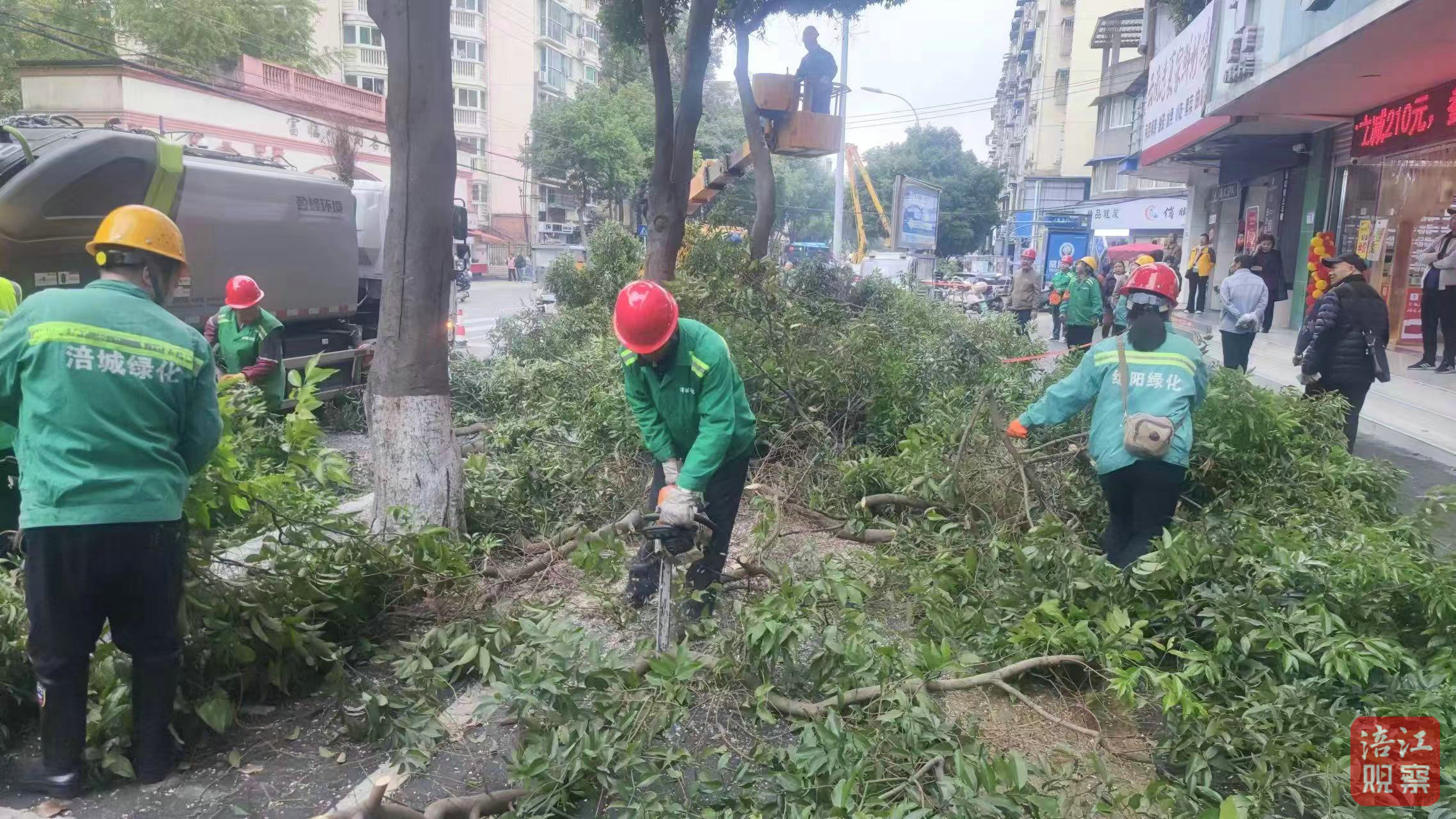 11月10日,躍進(jìn)路北段的修剪現(xiàn)場,高空作業(yè)車將涪城區(qū)的綠化工人們穩(wěn)穩(wěn)托起,他們頭戴安全帽,手持油鋸,眼神專注。隨著油鋸嗡鳴,過密、雜亂的枝條應(yīng)聲而落,動作干凈利落。地面上,有人指揮高空作業(yè),確保安全;有人將剪落的枝條整理、分段,送入木料粉碎車。環(huán)衛(wèi)工人緊隨其后清掃碎屑,整個過程高效流暢。