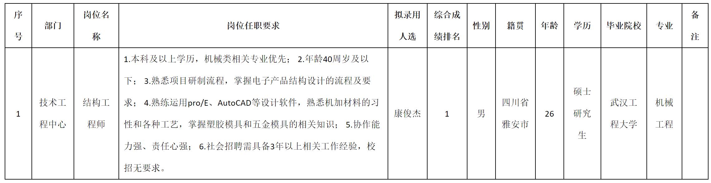 根據四川九洲光電科技股份有限公司發(fā)布的招聘公告及招聘相關規(guī)定,經測試、考察、體檢等程序,擬錄用康俊杰同志到四川九洲光電科技股份有限公司工作,現予以公示,具體情況如下: