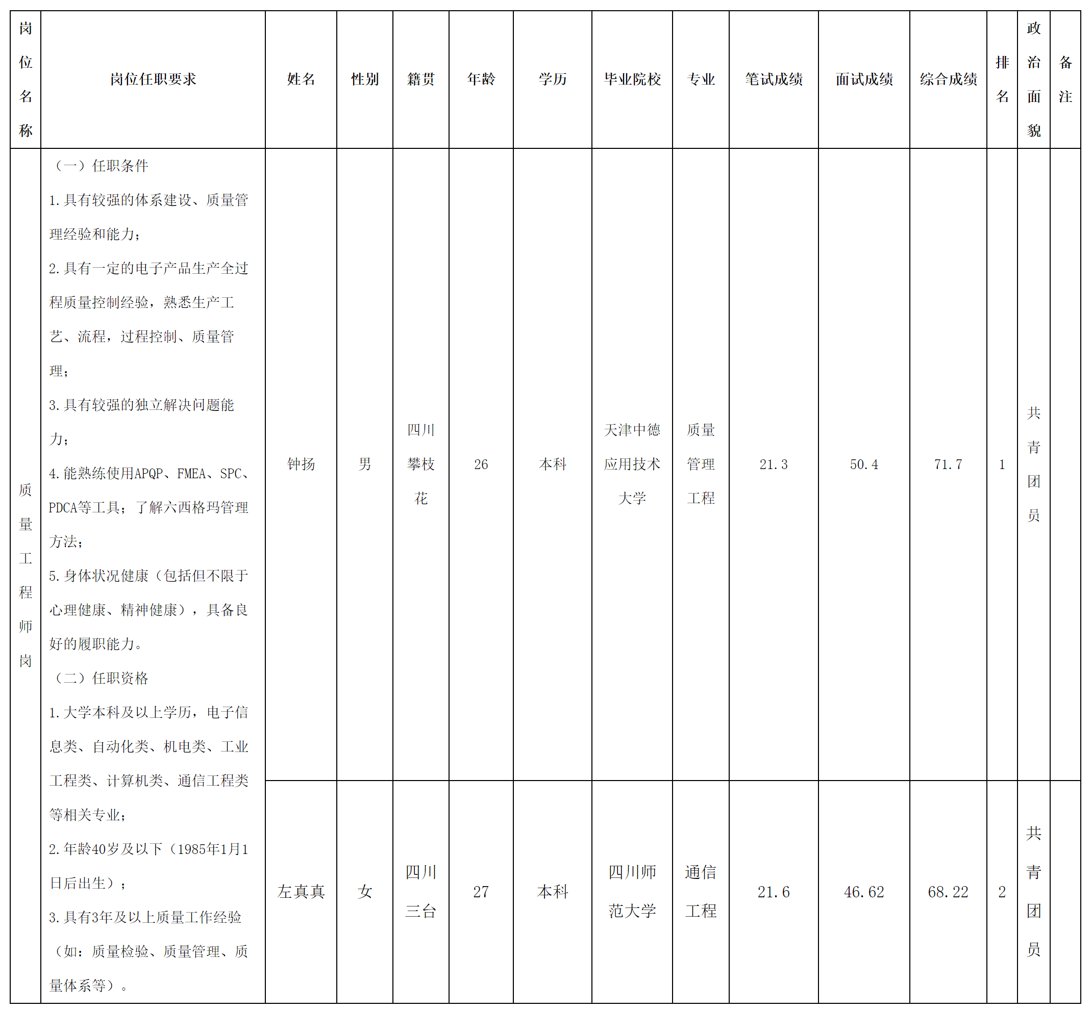 根據(jù)綿陽燃氣集團發(fā)布的招聘公告及招聘相關(guān)規(guī)定,經(jīng)筆試、面試等程序,現(xiàn)將綿陽能創(chuàng)科技有限責任公司質(zhì)量工程師崗位筆試、面試成績予以公示。