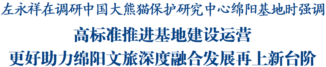 調(diào)研過程中,左永祥強(qiáng)調(diào),中國大熊貓保護(hù)研究中心綿陽基地肩負(fù)著物種保護(hù)、科普研學(xué)、生態(tài)體驗(yàn)等重要職能,也是綿陽文旅融合的靚麗名片。要以綿陽基地建成運(yùn)營為契機(jī),講好大熊貓故事、做好大熊貓文章,推動“MyPanda”大熊貓文化IP深度融入“青睞綿陽 熊貓有約”文旅品牌建設(shè),謀劃推出更多具有熊貓?jiān)氐男聢鼍靶聵I(yè)態(tài)新產(chǎn)品,走出一條具有綿陽特色的文旅深度融合發(fā)展新路子。要深入挖掘大熊貓文化內(nèi)涵,結(jié)合王朗自然保護(hù)區(qū)等周邊資源,精心設(shè)計(jì)科普內(nèi)容和互動體驗(yàn)項(xiàng)目,積極融入“大九寨”等文旅品牌建設(shè),強(qiáng)化全方位、多角度、立體化宣傳推廣,吸引更多人來消費(fèi)、旅游。要強(qiáng)化科研和人才支撐,依托中國大熊貓保護(hù)研究中心,深入開展大熊貓和伴生瀕危野生動物保護(hù)科學(xué)研究,做好大熊貓飼養(yǎng)繁育、疾病防控、野外救護(hù)、調(diào)查監(jiān)測等工作,推動更高水平的大熊貓保護(hù),更好助力大熊貓國家公園高質(zhì)量建設(shè)。