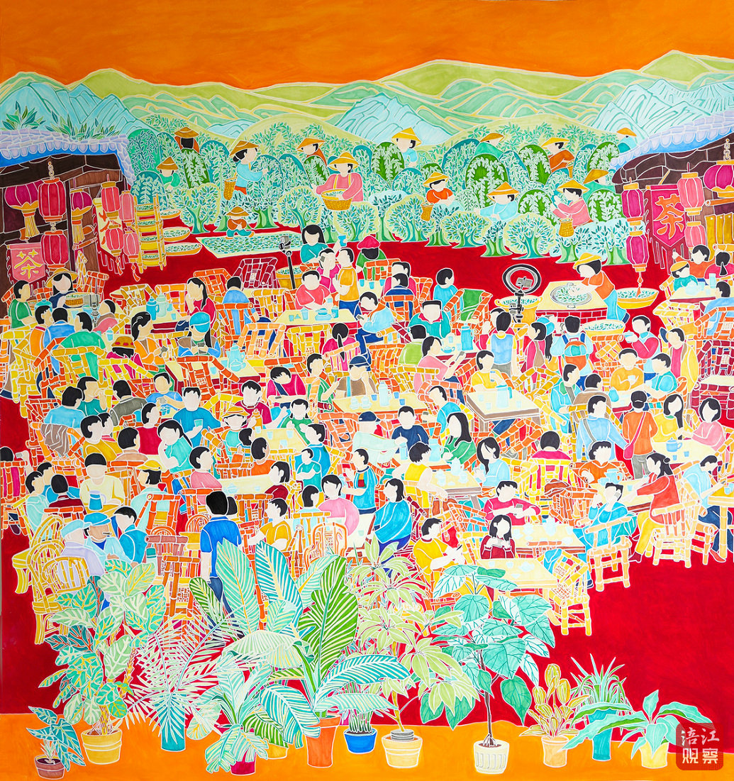 楊若雪的《茶香傳薪新·享茶品豐饒》構圖以幾何化梯田、圓桌茶宴構建秩序感,夸張變形的人物輪廓與茶樹形態(tài)釋放情感張力,形成“拙中藏巧”的視覺語言。作品畫面中,前幅呈現(xiàn)茶農古法采茶、曬青、炒制,與網絡直播賣茶光影交織,傳統(tǒng)技藝與數(shù)字浪潮在茶香中對話;后幅游客圍坐茶宴,笑語隨茶湯漾開,品茗升華為鄉(xiāng)村美學儀式。作品以“薪火”續(xù)文化基因,以“豐饒”繪產業(yè)圖景,在鄉(xiāng)土煙火中熔鑄時代精神。觀者既見茶山律動,亦品振興史詩。