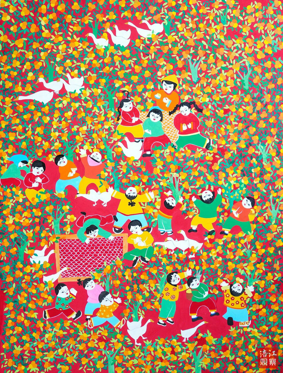 陳維兵的《幸福果農》源于鄉(xiāng)村生活,描繪了勞動情景和幸福生活的景象,通過夸張的造型和濃烈的色彩,生動刻畫村民協(xié)作勞動的場景。作品畫面風格吉祥喜慶,表現(xiàn)了老百姓樂觀向上的生活追求和審美情趣。作品畫面色彩絢麗濃烈,裝飾平和自然,線條簡練,凸顯農民畫質樸奔放的藝術特色,表現(xiàn)了老百姓對美好生活的向往以及對真善美的渴望與追求。