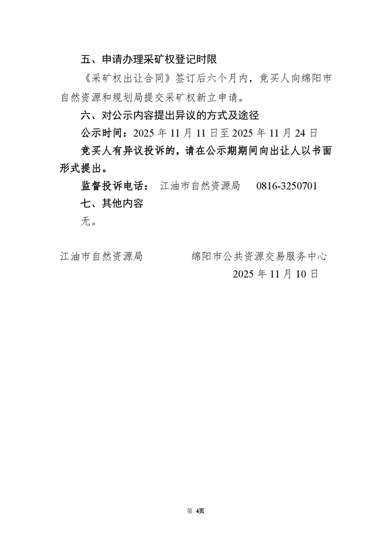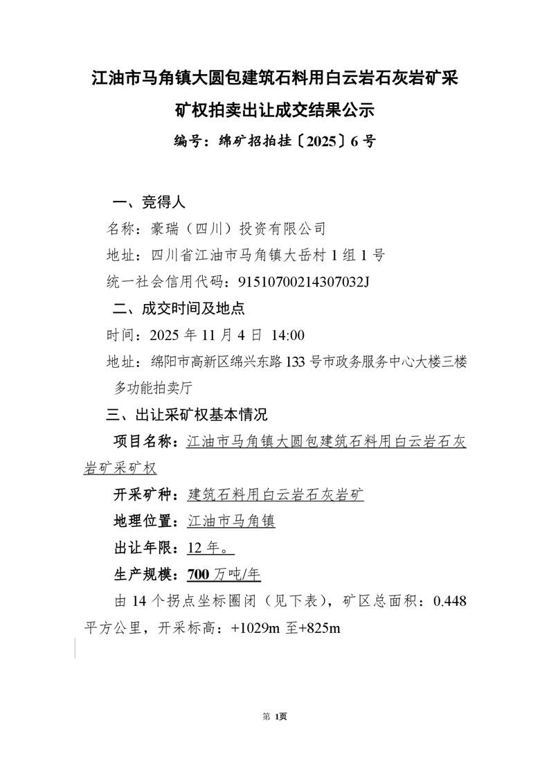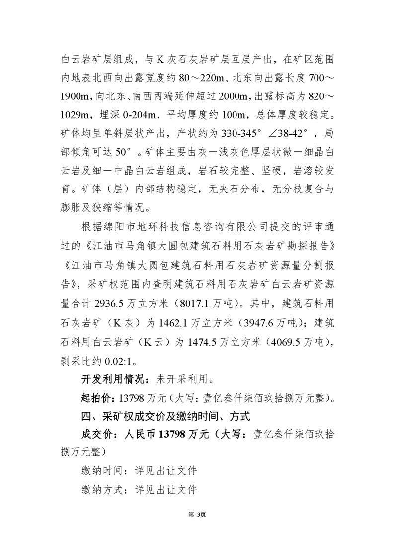 江油市馬角鎮(zhèn)大圓包建筑石料用白云巖石灰?guī)r礦采礦權拍賣出讓成交結果公示(綿礦招拍掛〔2025〕6號)
