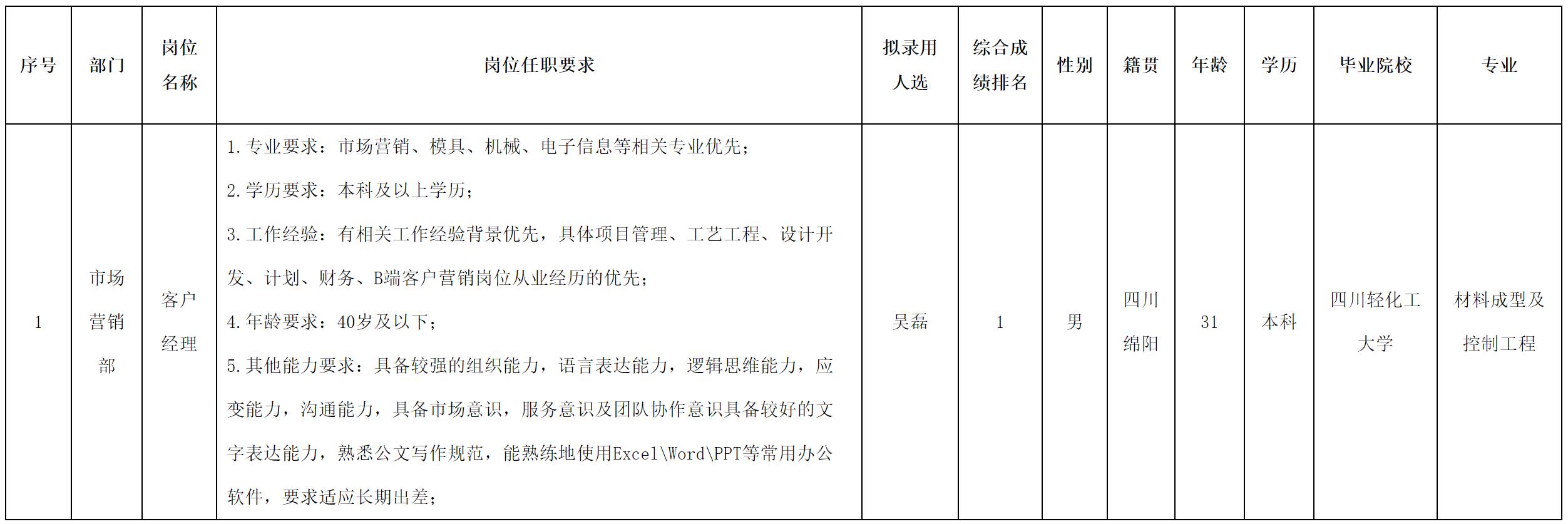 根據(jù)四川愛(ài)創(chuàng)科技有限公司發(fā)布的招聘公告及招聘相關(guān)規(guī)定,經(jīng)面試、考察、體檢等程序,擬錄用吳磊同志到市場(chǎng)營(yíng)銷部工作,現(xiàn)予以公示,具體情況如下: