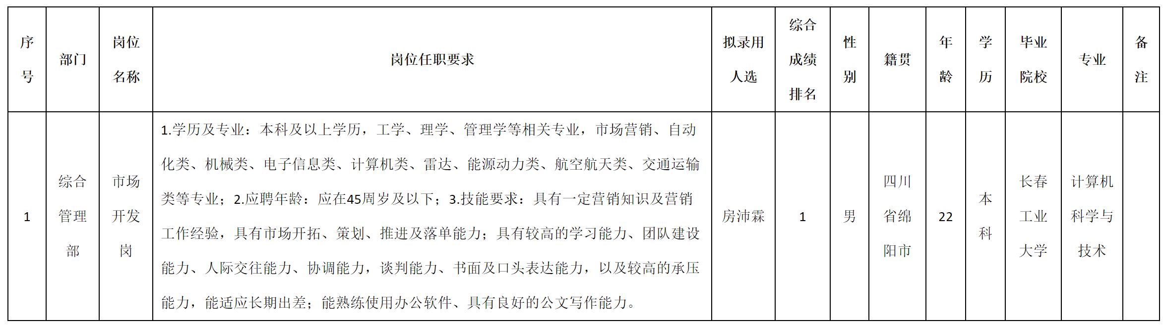 根據(jù)四川九洲永昌檢測技術(shù)服務(wù)有限責(zé)任公司發(fā)布的招聘公告及招聘相關(guān)規(guī)定,經(jīng)測試、考察、體檢等程序,擬錄用房沛霖同志到四川九洲永昌檢測技術(shù)服務(wù)有限責(zé)任公司工作,現(xiàn)予以公示,具體情況如下: