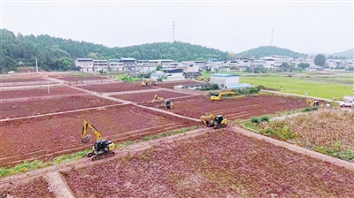 金石鎮(zhèn)三秀村,大型機(jī)械實(shí)施“小田”變“大田”改造。 記者 李春梅 攝