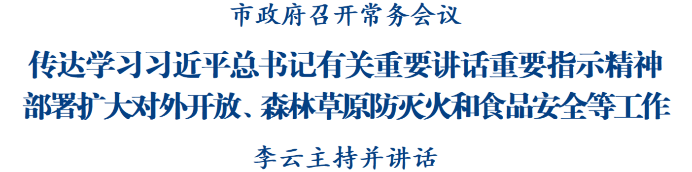 11月17日,市政府召開(kāi)第122次常務(wù)會(huì)議,傳達(dá)學(xué)習(xí)習(xí)近平總書(shū)記有關(guān)重要講話重要指示精神,部署擴(kuò)大對(duì)外開(kāi)放、森林草原防滅火和食品安全等工作。市委副書(shū)記、市長(zhǎng)李云主持會(huì)議并講話