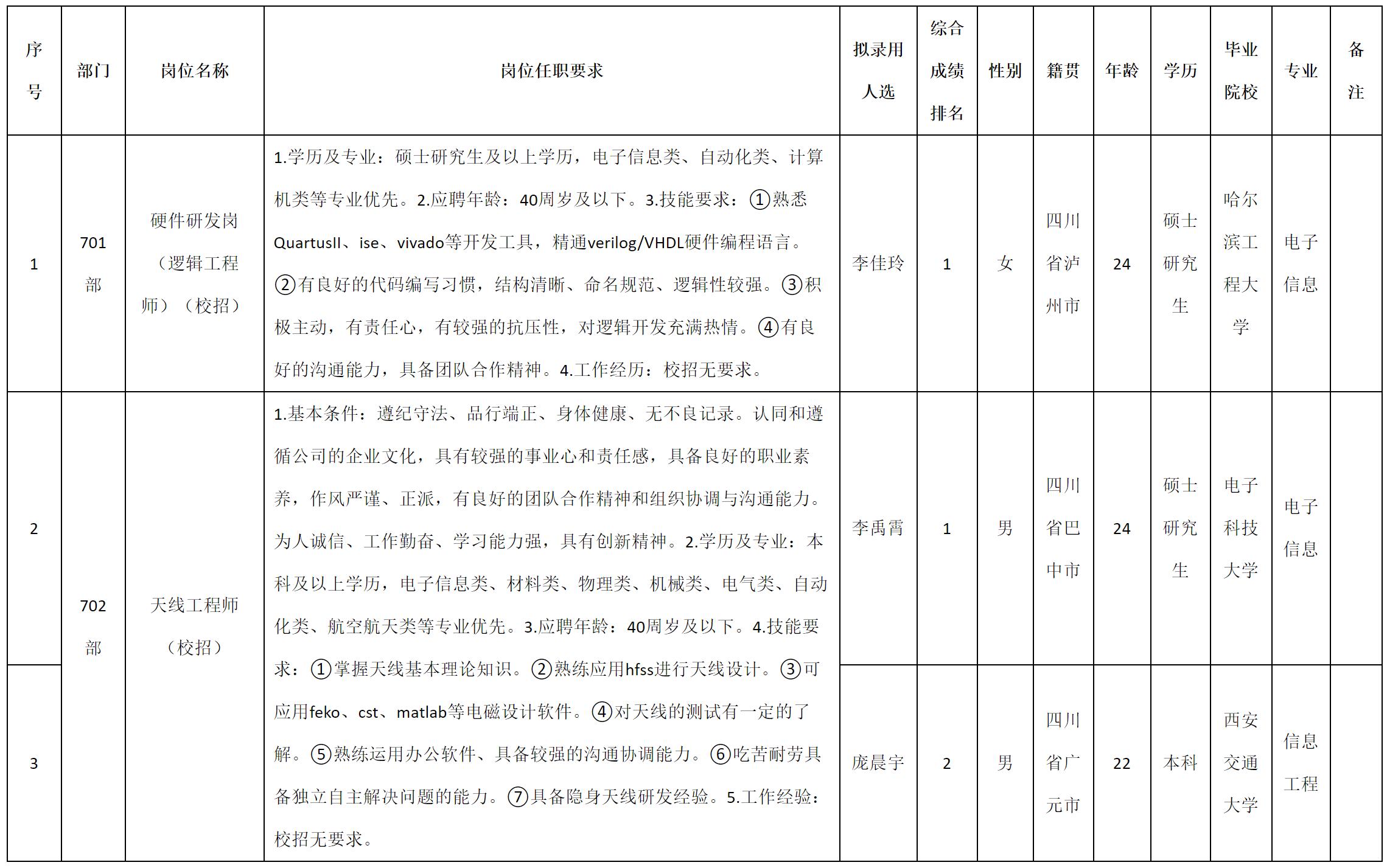 根據(jù)四川九洲電器集團(tuán)有限責(zé)任公司發(fā)布的招聘公告及招聘相關(guān)規(guī)定,經(jīng)測試、考察、體檢等程序,擬錄用李佳玲等3名同志到四川九洲電器集團(tuán)有限責(zé)任公司工作,現(xiàn)予以公示,具體情況如下: