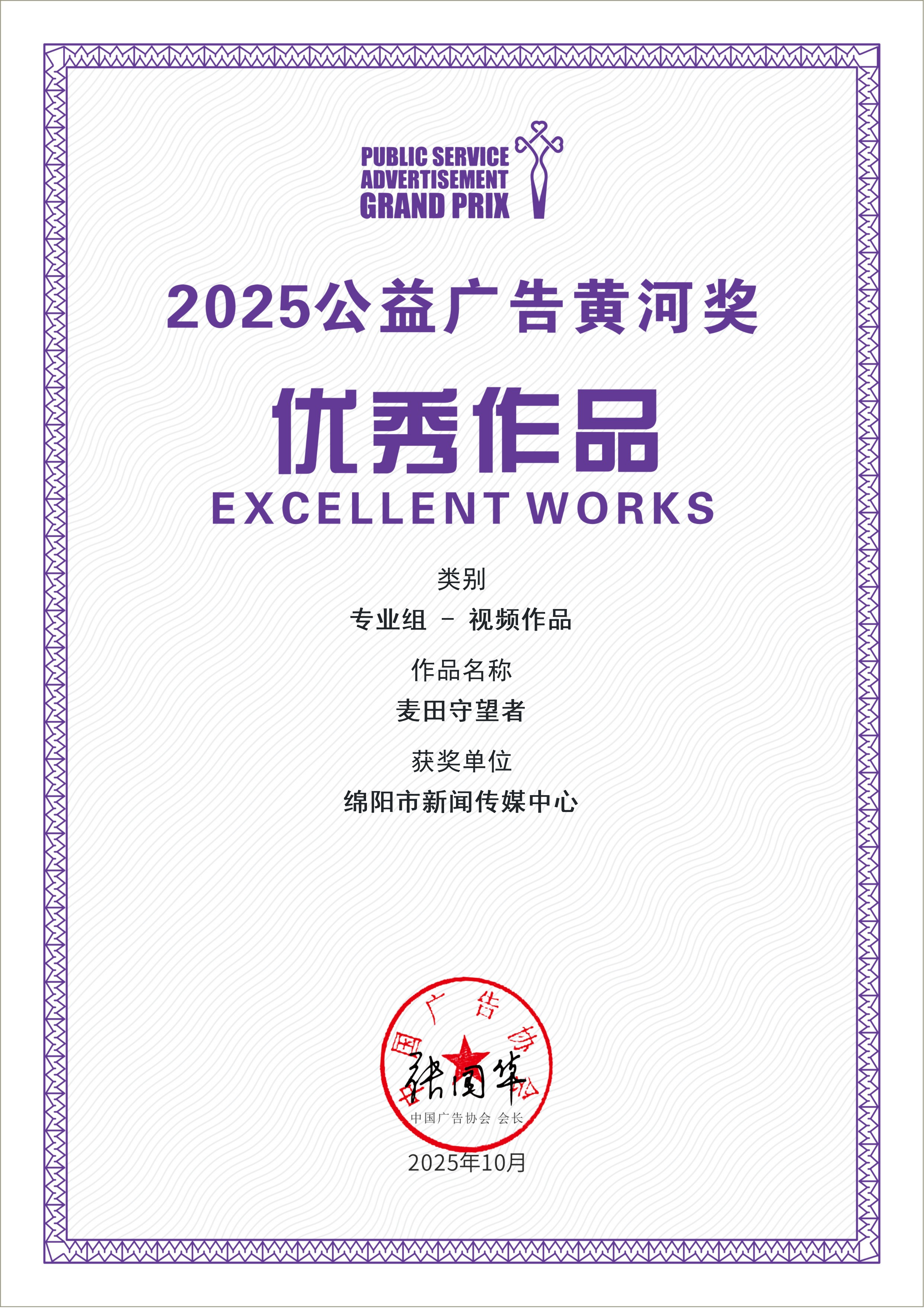 近日,2025公益廣告黃河獎頒獎典禮在青島舉行。由綿陽市新聞傳媒中心“益心向陽”公益廣告工作室創(chuàng)作的公益廣告短片《麥田守望者》榮獲專業(yè)組優(yōu)秀作品獎,標(biāo)志著綿陽市新聞傳媒中心在公益廣告創(chuàng)作與傳播領(lǐng)域邁上新臺階。
