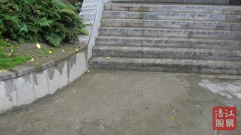 天橋下的臺階則是另一處“重災(zāi)區(qū)”。記者看到,臺階表面幾乎被旁邊綠化帶溢出的泥土覆蓋,部分區(qū)域同樣長了青苔,踩上去黏滑泥濘,行走十分困難。“這邊更滑!泥巴都濺到地面上了,根本不敢走。”一位市民指著臺階無奈說道。