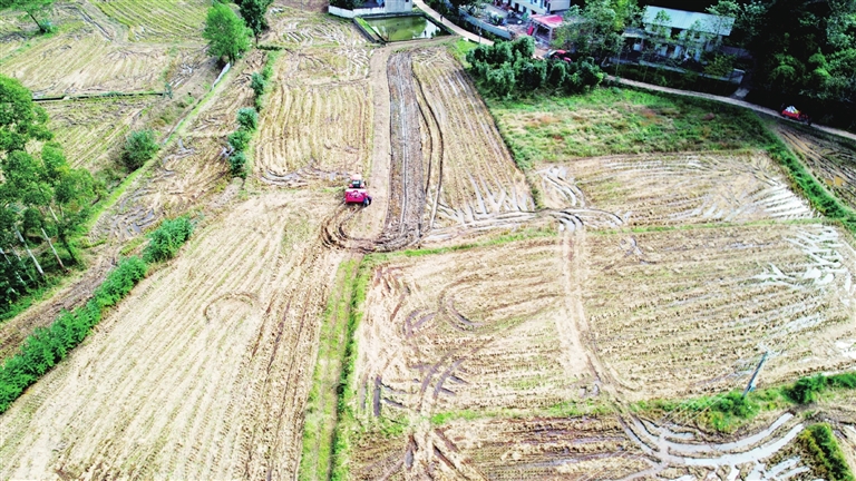 同一天,在安州區(qū)黃土鎮(zhèn)鹽井村,剛剛完成水稻收割的田地里還留著一排排稻茬,3臺大型播種機已駛?cè)胩镩g展開作業(yè)。伴隨著機械的轟鳴聲,一塊塊田地被快速整理成疏松平整的苗床。