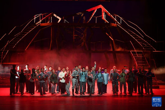 11月21日晚,2025援疆省市精品舞臺(tái)劇目展演季重點(diǎn)劇目——原創(chuàng)紅色題材大型現(xiàn)代黃梅戲《鑄魂天山》在新疆烏魯木齊京劇院首演。