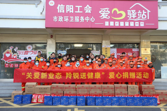 11月22日,正是二十四節(jié)氣的小雪,新縣金蘭山街道康畈社區(qū)內(nèi),外賣員、快遞員等新就業(yè)群體代表喜提“冬日暖心禮包”;信陽市政環(huán)衛(wèi)服務(wù)中心工會愛心驛站里,羚銳制藥聯(lián)合信陽市總工會舉辦的“關(guān)愛新業(yè)態(tài),羚銳送健康”愛心捐贈活動在此展開,為在寒風(fēng)中堅(jiān)守崗位的戶外勞動者們送上價值近10萬元的愛心物資,現(xiàn)場掌聲不斷,暖意融融。
