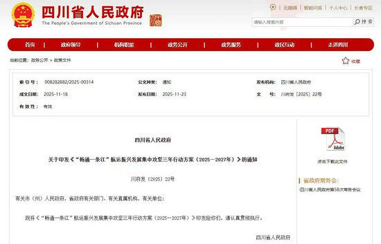 據(jù)四川省人民政府網(wǎng)站消息,為加快交通強(qiáng)省建設(shè),補(bǔ)齊水運(yùn)基礎(chǔ)設(shè)施短板,推動(dòng)物流降本提質(zhì)增效,更好服務(wù)全省經(jīng)濟(jì)社會(huì)發(fā)展,結(jié)合水運(yùn)發(fā)展實(shí)際,近日,省政府印發(fā)了《“暢通一條江”航運(yùn)振興發(fā)展集中攻堅(jiān)三年行動(dòng)方案(2025—2027年)》(以下簡(jiǎn)稱《方案》)。