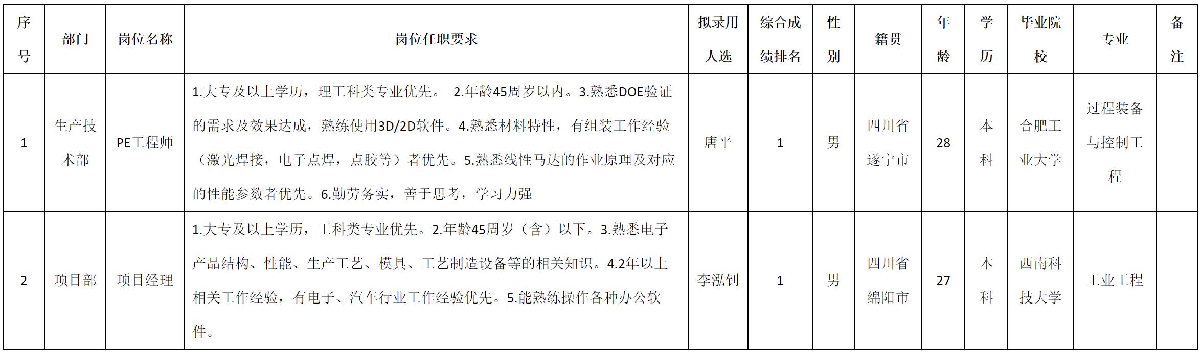 根據(jù)四川安和精密電子電器股份有限公司發(fā)布的招聘公告及招聘相關(guān)規(guī)定,經(jīng)測(cè)試、考察、體檢等程序,擬錄用唐平等2名同志到四川安和精密電子電器股份有限公司工作,現(xiàn)予以公示,具體情況如下: