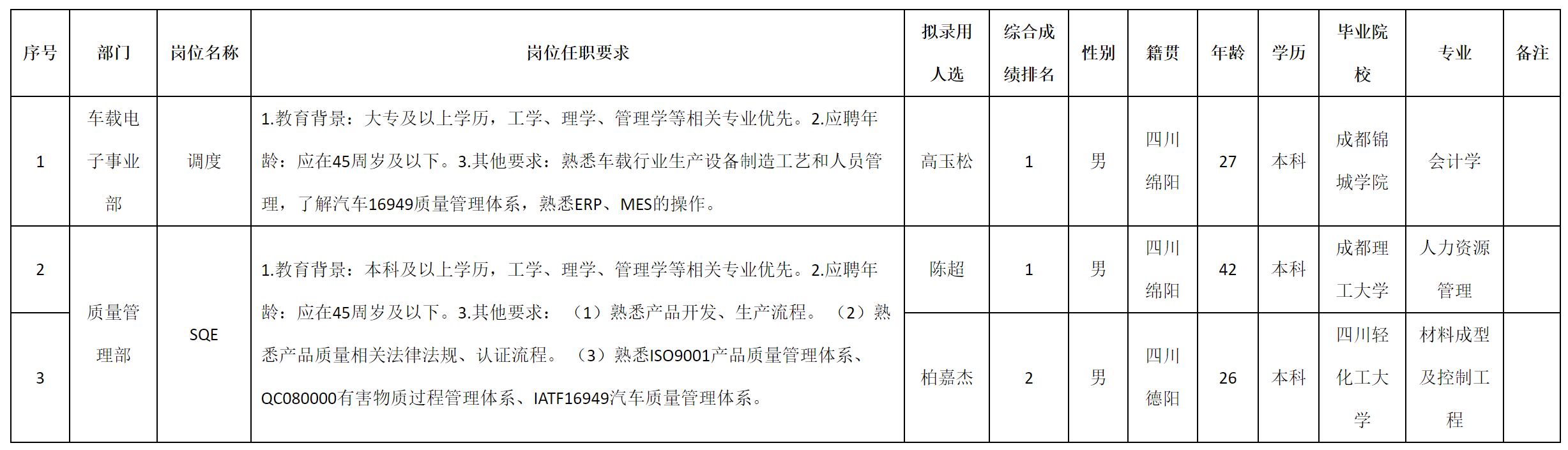 根據(jù)四川九州電子科技股份有限公司發(fā)布的招聘公告及招聘相關規(guī)定,經測試、考察、體檢等程序,擬錄用高玉松等3名同志到四川九州電子科技股份有限公司工作,現(xiàn)予以公示,具體情況如下: