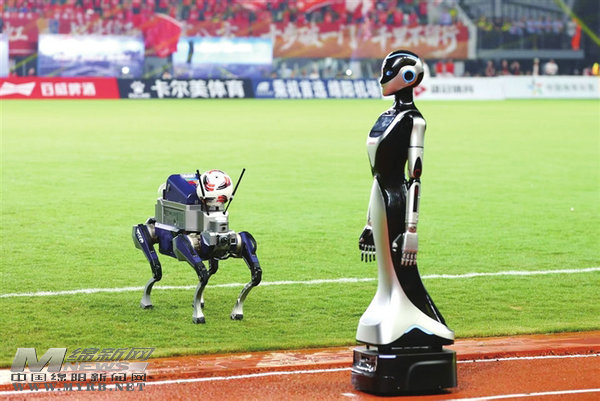 “綿陽造”機器狼運送比賽用球至嘉賓處。 記者 陳冬冬 攝