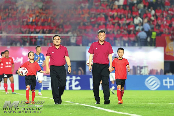 10月25日晚,川超綿陽九洲長虹隊對陣廣元劍門雄關(guān)隊的比賽現(xiàn)場,中國工程物理研究院(簡稱“中物院”)老一輩科研工作者子弟、四川省足球協(xié)會原秘書長李日新,與中物院新生代科研工作者子女、綿陽科學(xué)城春蕾學(xué)校學(xué)生韓思媛,攜手為比賽開球。