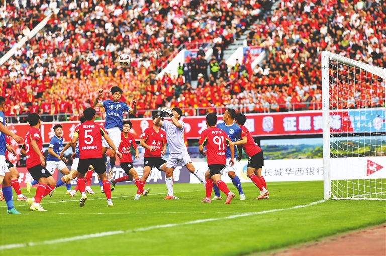 11月9日,綿陽九洲長虹隊(duì)客場(chǎng)迎戰(zhàn)德陽重裝隊(duì)比賽中,綿陽隊(duì)球員門前爭(zhēng)頂。 記者 陳冬冬 攝