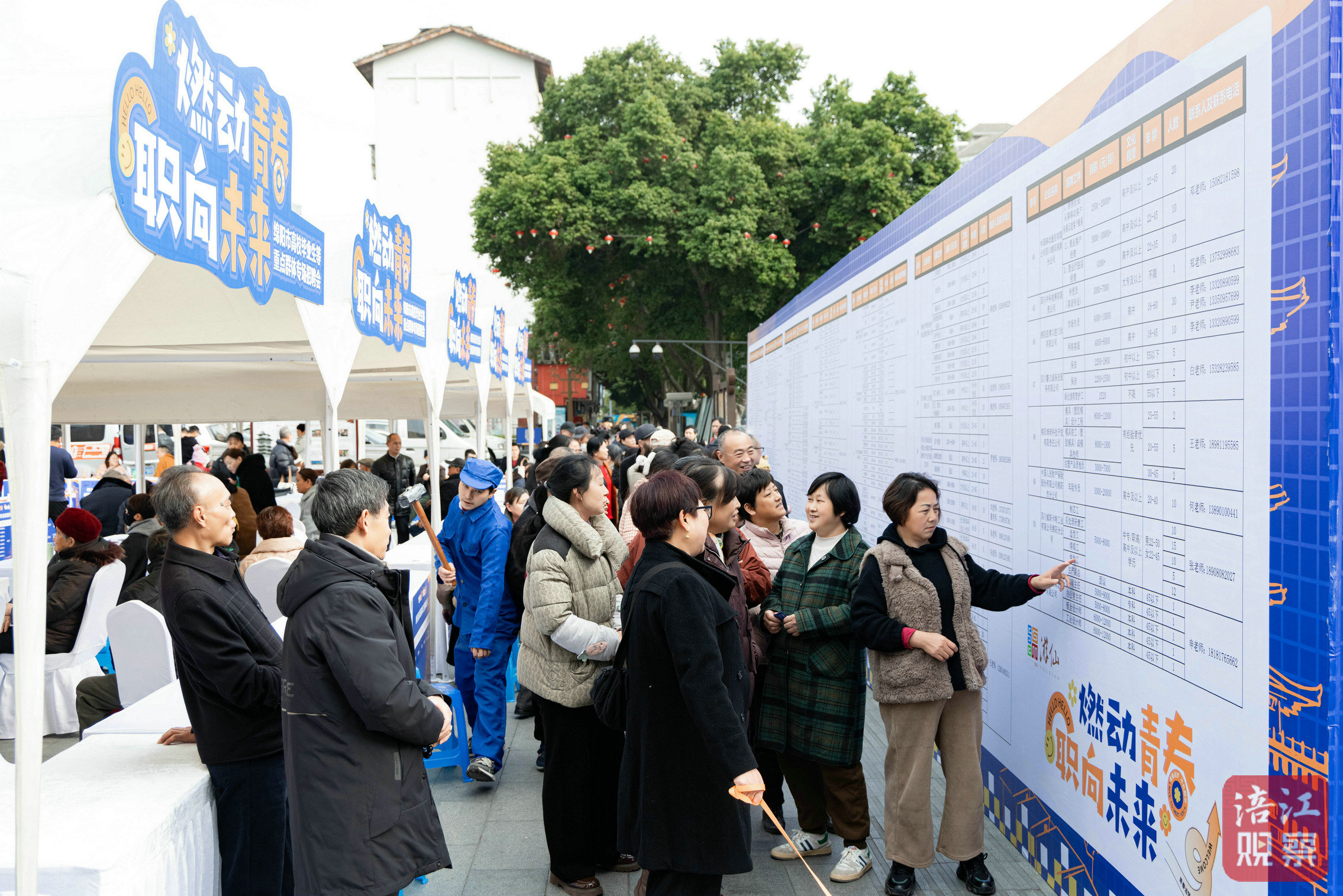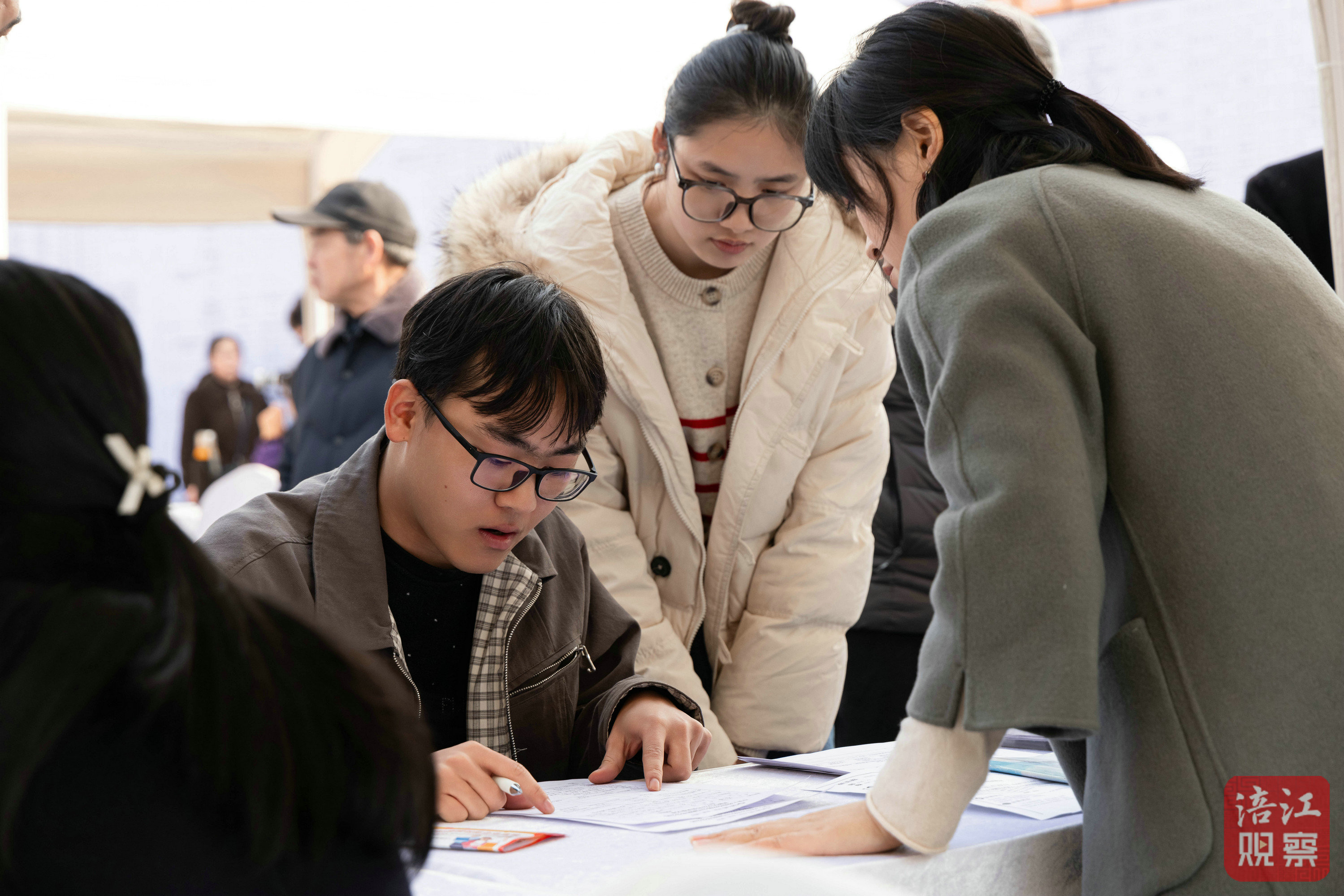 在舞臺正前方,現(xiàn)場支起了30余個招聘展位,每個“攤位”前擺放著崗位需求牌,“攤主”們正使出渾身解數(shù)“求賢”。求職者們穿梭其中,或詢問“攤主”,或駐足觀看……