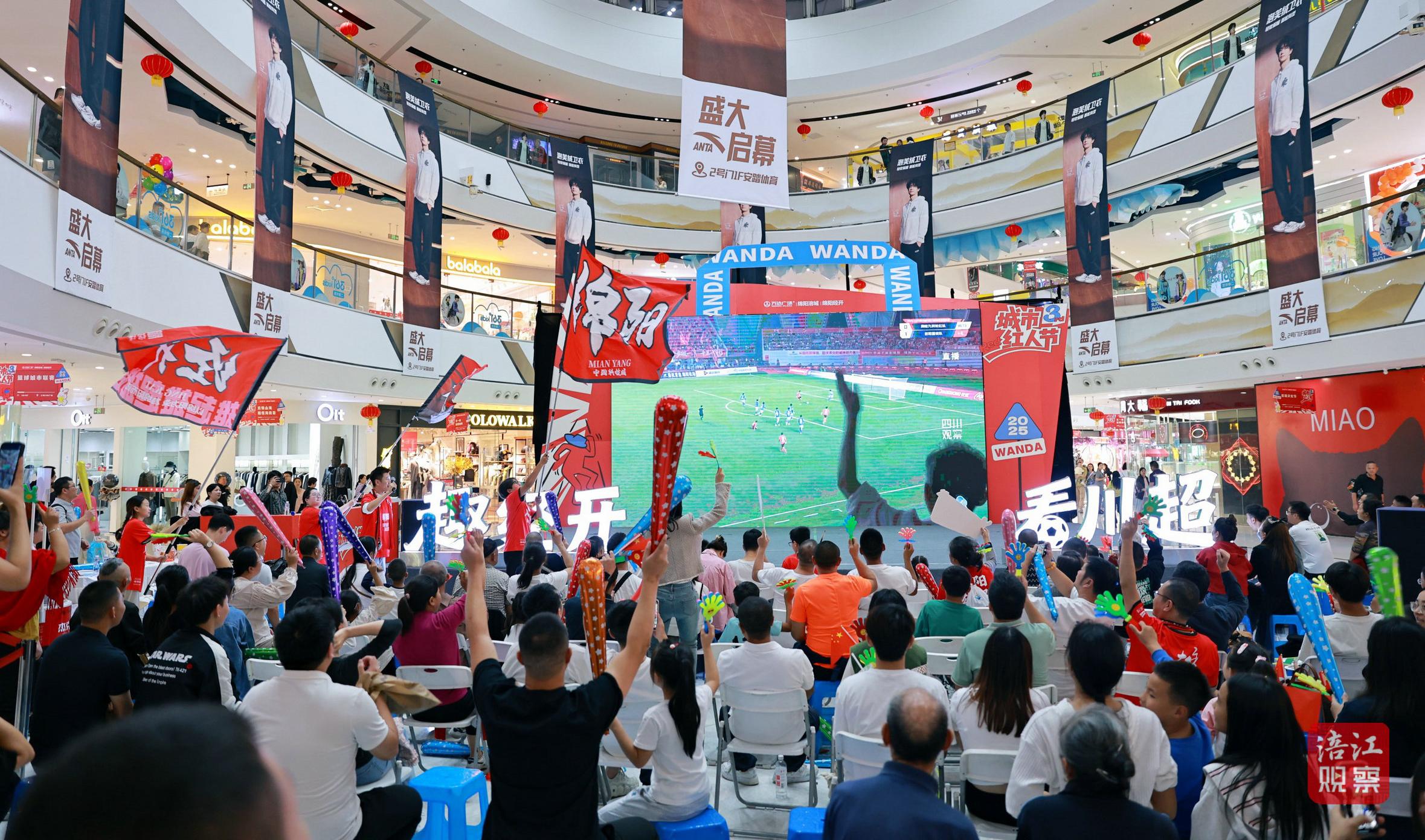 10月7日晚,川超聯(lián)賽綿陽九洲長(zhǎng)虹隊(duì)主場(chǎng)對(duì)陣德陽重裝隊(duì)。球迷聚集在第二觀賽點(diǎn)經(jīng)開萬達(dá)廣場(chǎng),為綿陽隊(duì)吶喊助威。