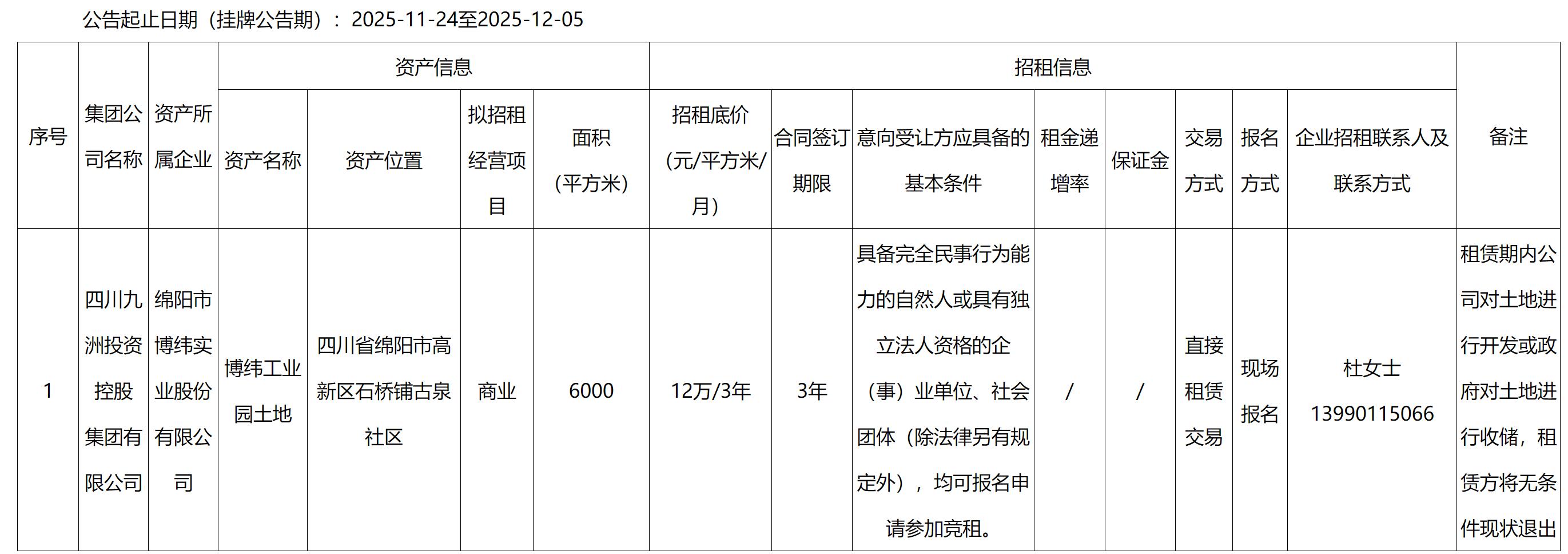 四川九洲千城商業(yè)管理有限公司園區(qū)項目部代管資產(chǎn)出租公告