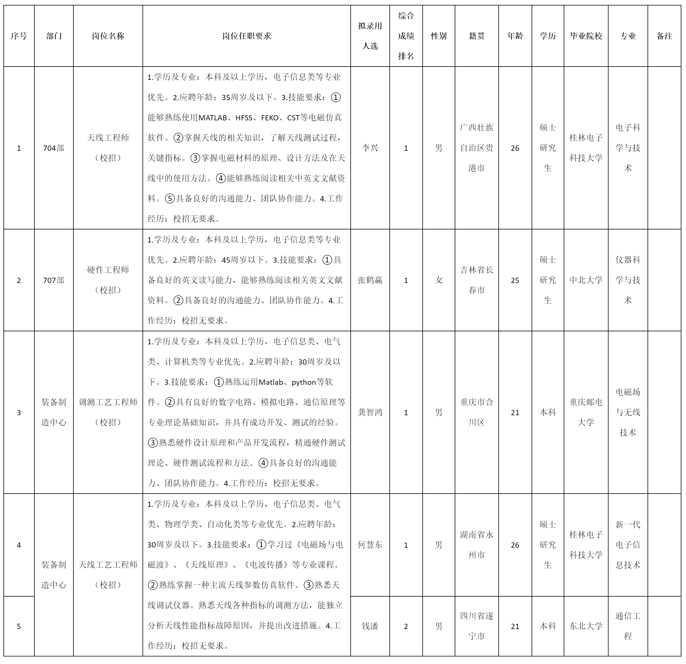 根據(jù)四川九洲電器集團(tuán)有限責(zé)任公司發(fā)布的招聘公告及招聘相關(guān)規(guī)定,經(jīng)測(cè)試、考察、體檢等程序,擬錄用李興等5名同志到四川九洲電器集團(tuán)有限責(zé)任公司工作,現(xiàn)予以公示,具體情況如下: