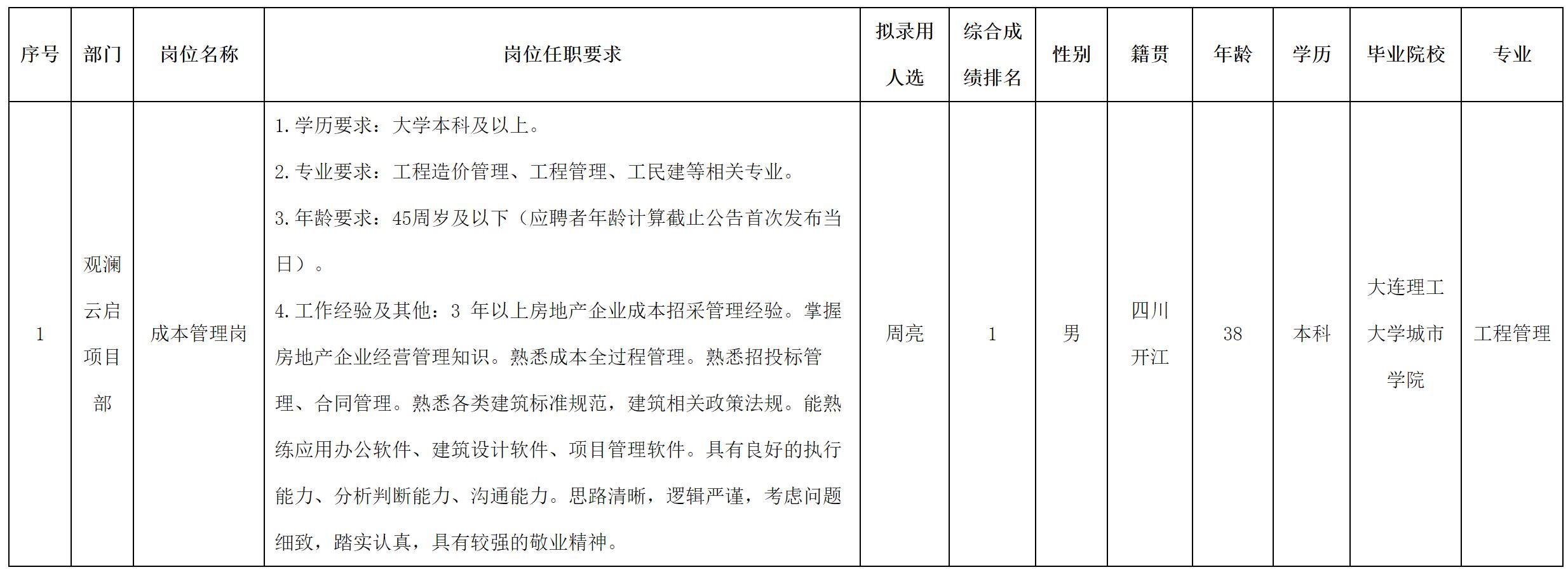 根據(jù)綿陽市綿投置地有限公司發(fā)布的招聘公告及招聘相關(guān)規(guī)定,經(jīng)筆試、面試、考察、體檢等程序,擬錄用周亮同志到綿陽市綿投置地有限公司工作,現(xiàn)予以公示,具體情況如下: