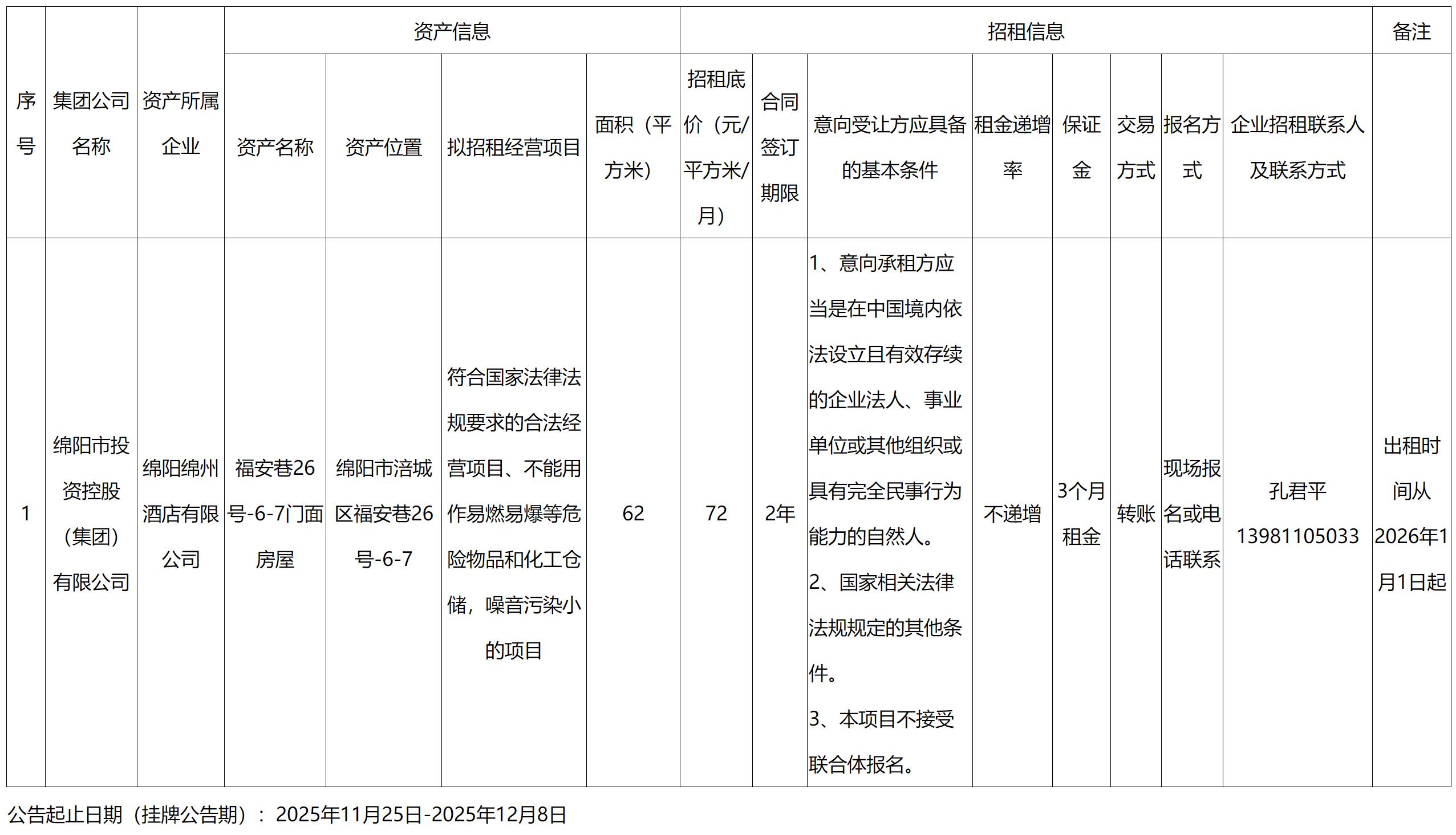 綿陽(yáng)綿州酒店有限公司資產(chǎn)招租信息公告