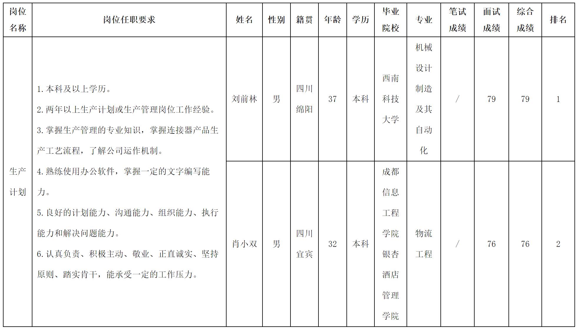 根據(jù)四川華豐科技股份有限公司發(fā)布的招聘公告及招聘相關(guān)規(guī)定,現(xiàn)將測(cè)試成績(jī)予以公示。