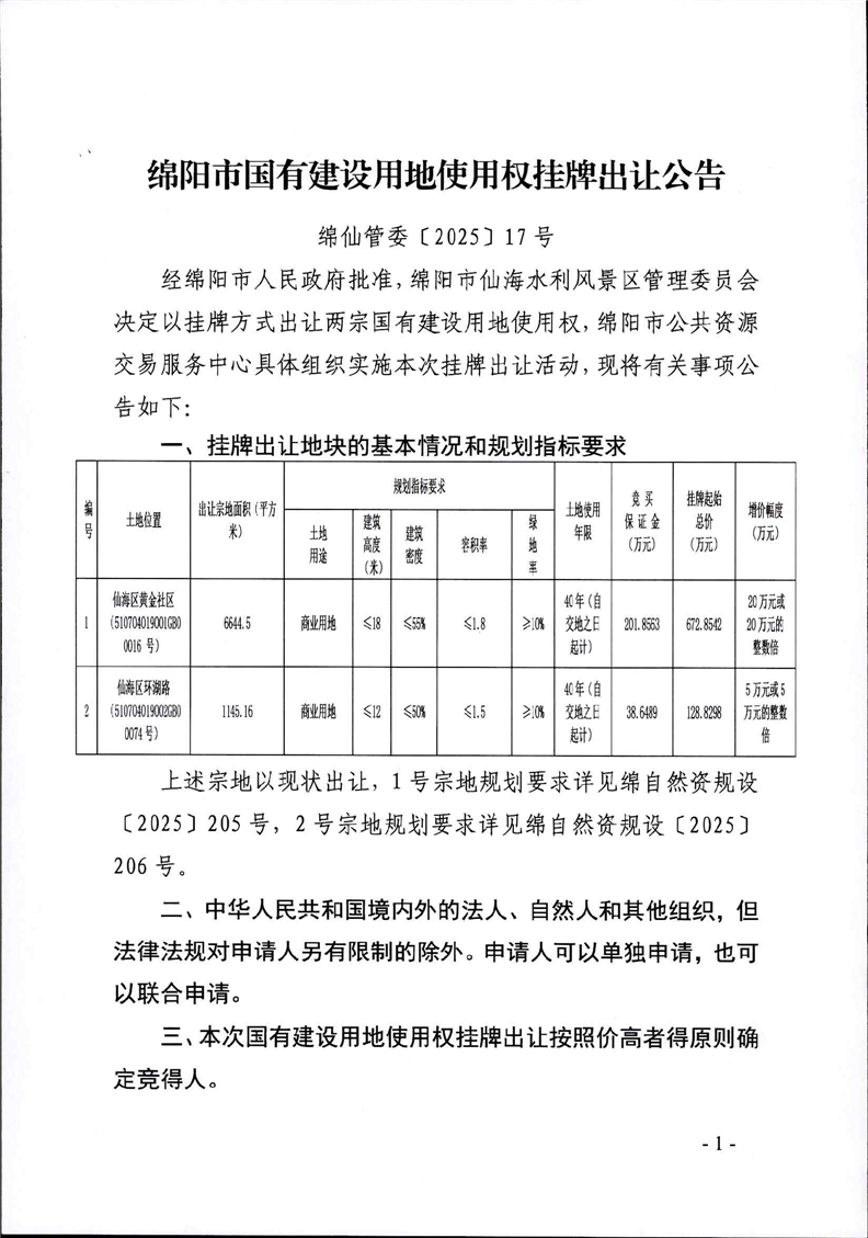綿陽市國有建設用地使用權掛牌出讓公告(綿仙管委〔2025號〕17號)