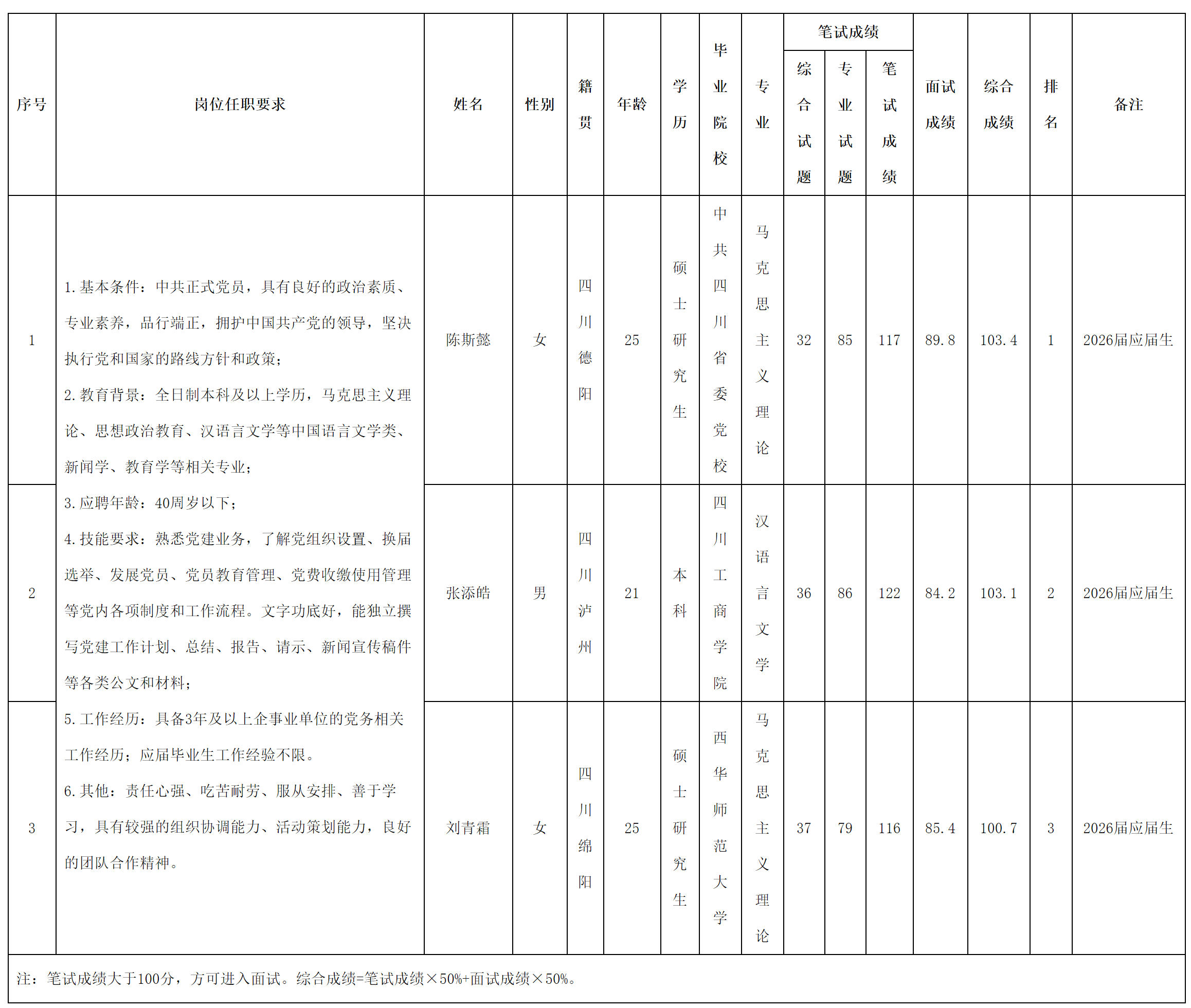 根據(jù)綿陽路橋建設(shè)集團(tuán)有限責(zé)任公司發(fā)布的招聘公告及招聘相關(guān)規(guī)定,經(jīng)筆試、面試等程序,現(xiàn)將成績予以公示。