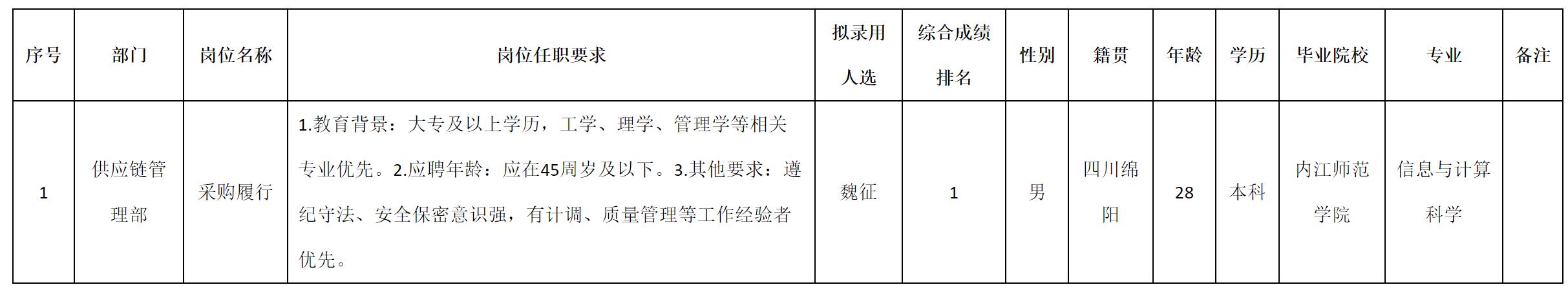 根據(jù)四川九州電子科技股份有限公司發(fā)布的招聘公告及招聘相關(guān)規(guī)定,經(jīng)測試、考察、體檢等程序,擬錄用魏征同志到四川九州電子科技股份有限公司工作,現(xiàn)予以公示,具體情況如下: