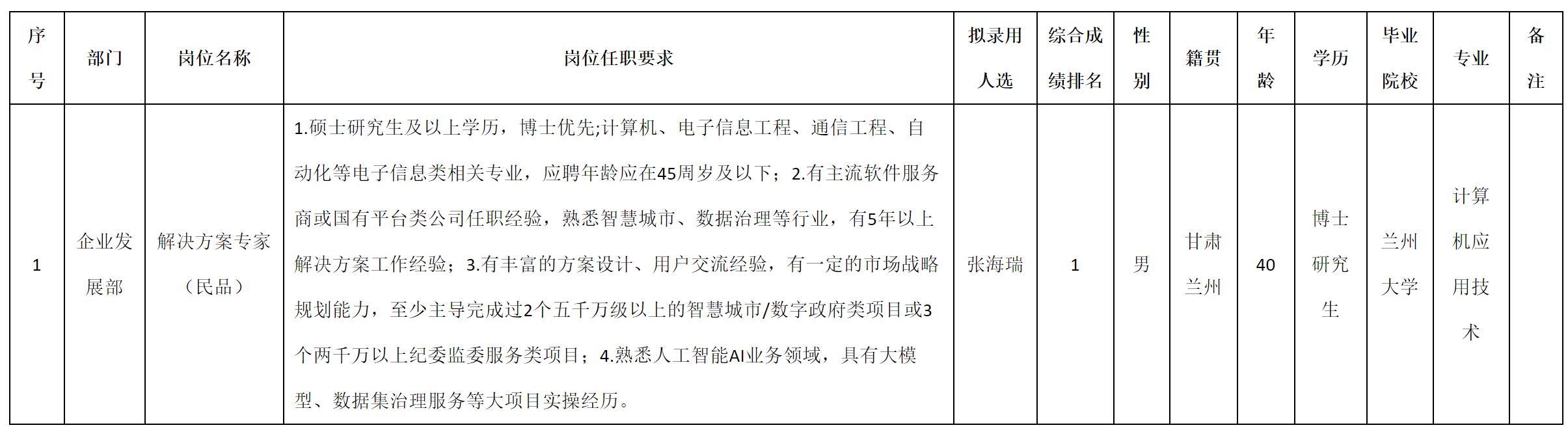 根據(jù)四川九洲投資控股集團(tuán)有限公司軟件與數(shù)據(jù)智能軍團(tuán)發(fā)布的招聘公告及招聘相關(guān)規(guī)定,經(jīng)測試、考察、體檢等程序,擬錄用張海瑞同志到四川九洲投資控股集團(tuán)有限公司軟件與數(shù)據(jù)智能軍團(tuán)工作,現(xiàn)予以公示,具體情況如下: