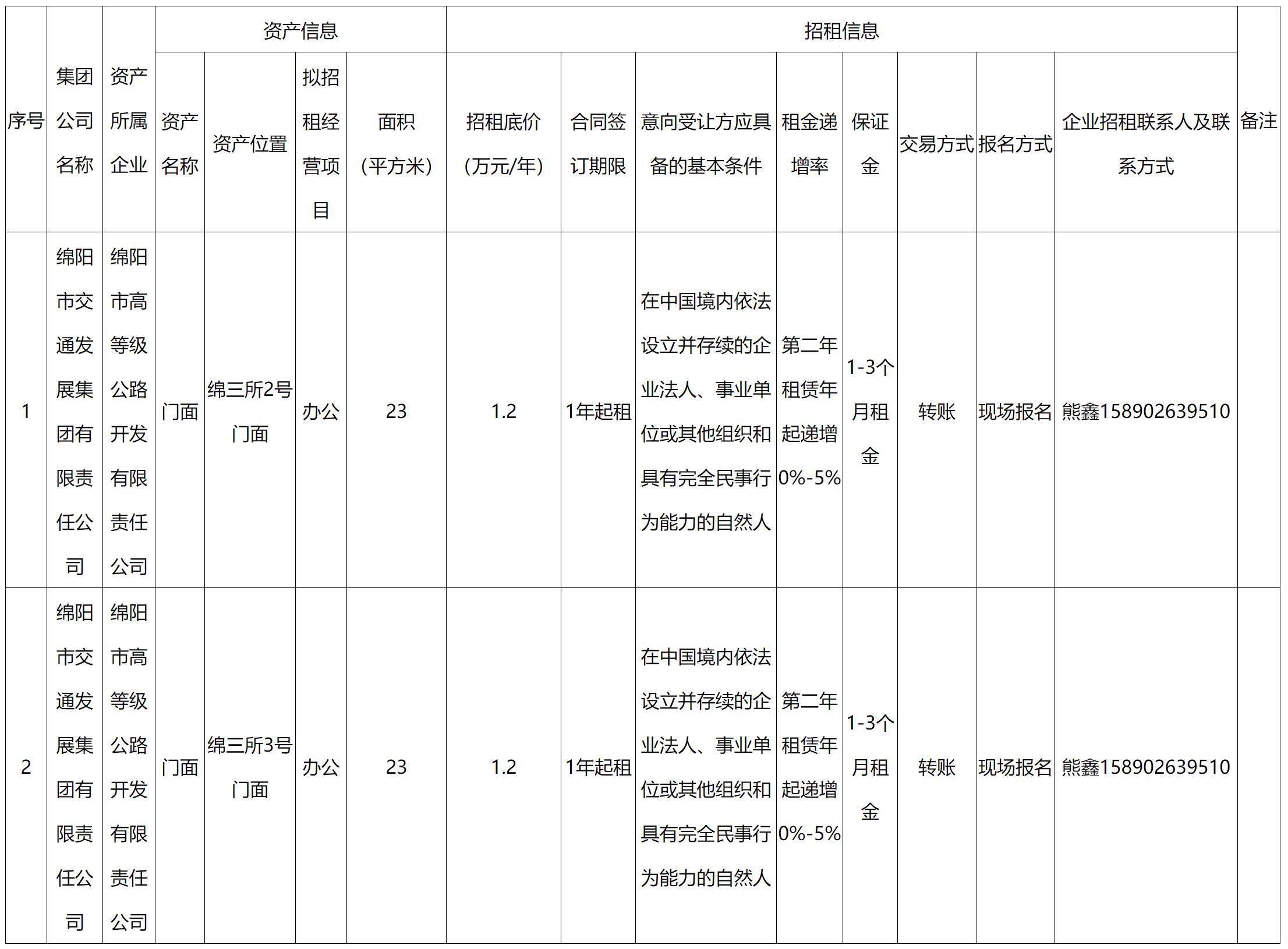 綿陽市高等級公路開發(fā)有限責(zé)任公司現(xiàn)有部分空置場院對外公開招租,歡迎有意向的單位、個體工商戶、自然人報名競價,現(xiàn)將相關(guān)事宜公告如下: