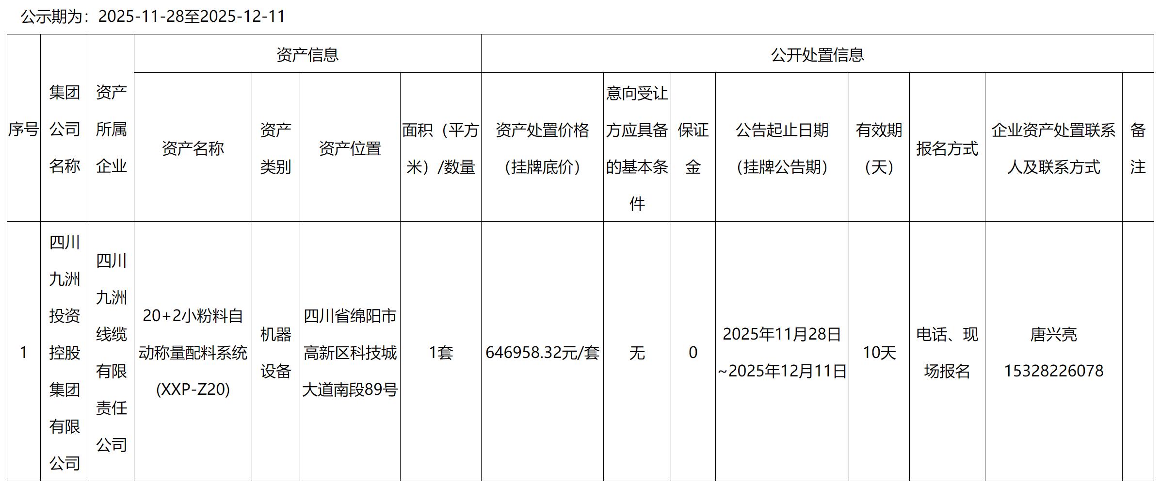 四川九洲線纜有限責(zé)任公司物理發(fā)泡生產(chǎn)設(shè)備資產(chǎn)處置公告