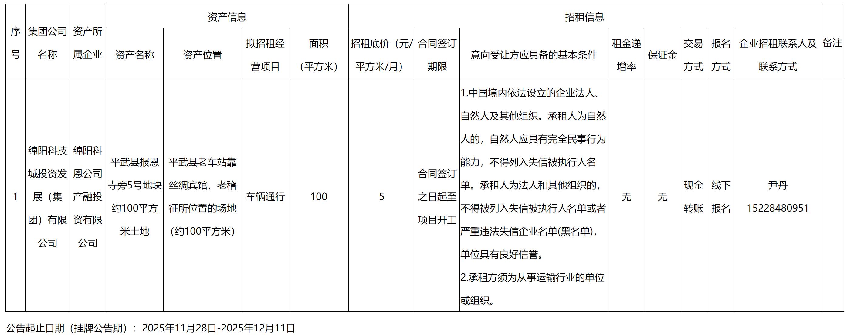 綿陽科恩公司產(chǎn)融投資有限公司資產(chǎn)出租公告