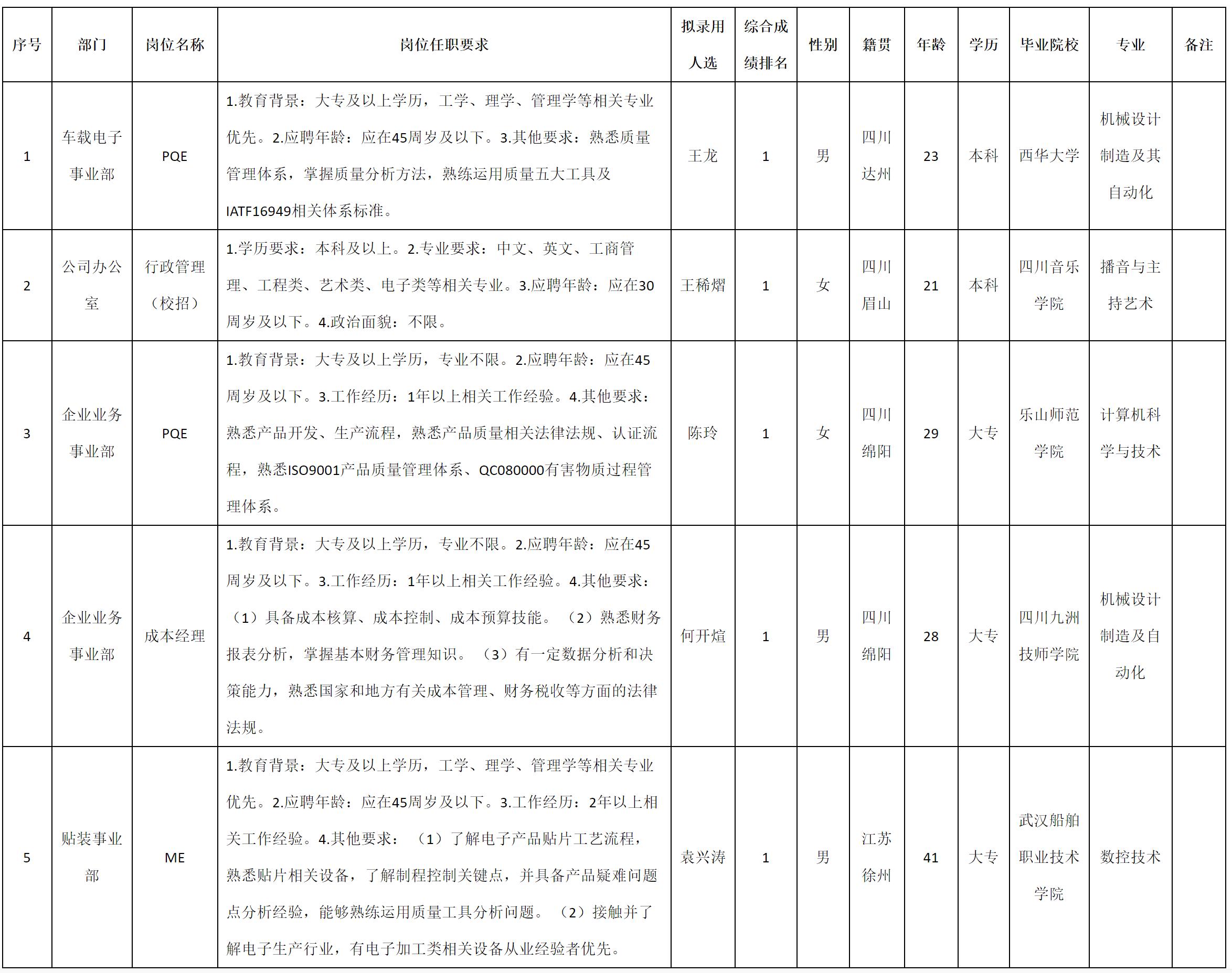 根據(jù)四川九州電子科技股份有限公司發(fā)布的招聘公告及招聘相關(guān)規(guī)定,經(jīng)測試、考察、體檢等程序,擬錄用王龍等5名同志到四川九州電子科技股份有限公司工作,現(xiàn)予以公示,具體情況如下:
