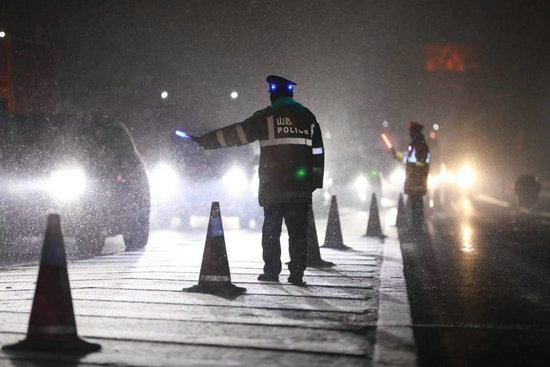 交警在雪天指揮車(chē)輛通行(資料圖片)。 新華社發(fā)