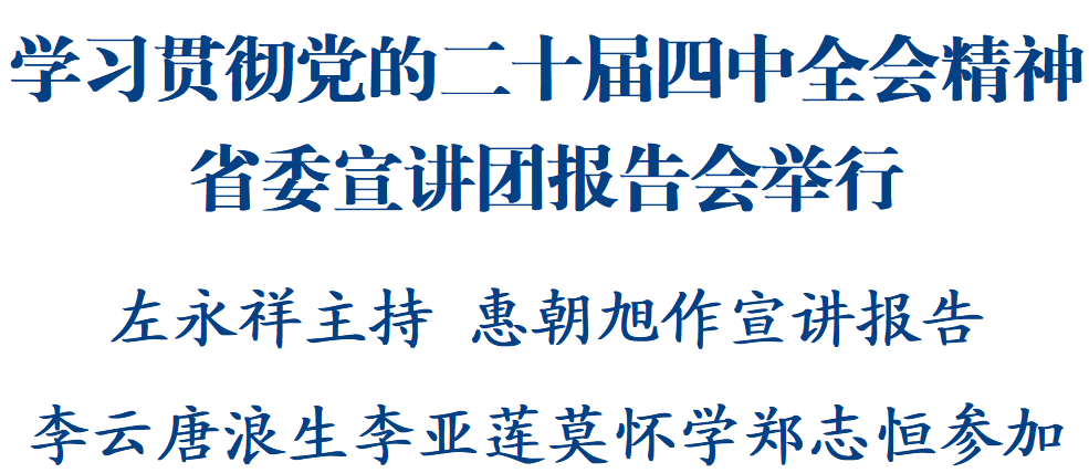 根據(jù)省委統(tǒng)一部署,12月3日,學(xué)習(xí)貫徹黨的二十屆四中全會(huì)精神省委宣講團(tuán)報(bào)告會(huì)舉行。省委常委、市委書記左永祥主持報(bào)告會(huì)。省委宣講團(tuán)第九分團(tuán)負(fù)責(zé)人,省商務(wù)廳黨組書記、廳長惠朝旭作宣講報(bào)告。市委副書記、市長李云,市人大常委會(huì)主任唐浪生,市政協(xié)主席李亞蓮,市委副書記、政法委書記莫懷學(xué),市委常委、科技城管委會(huì)主任鄭志恒參加?! ?/p>