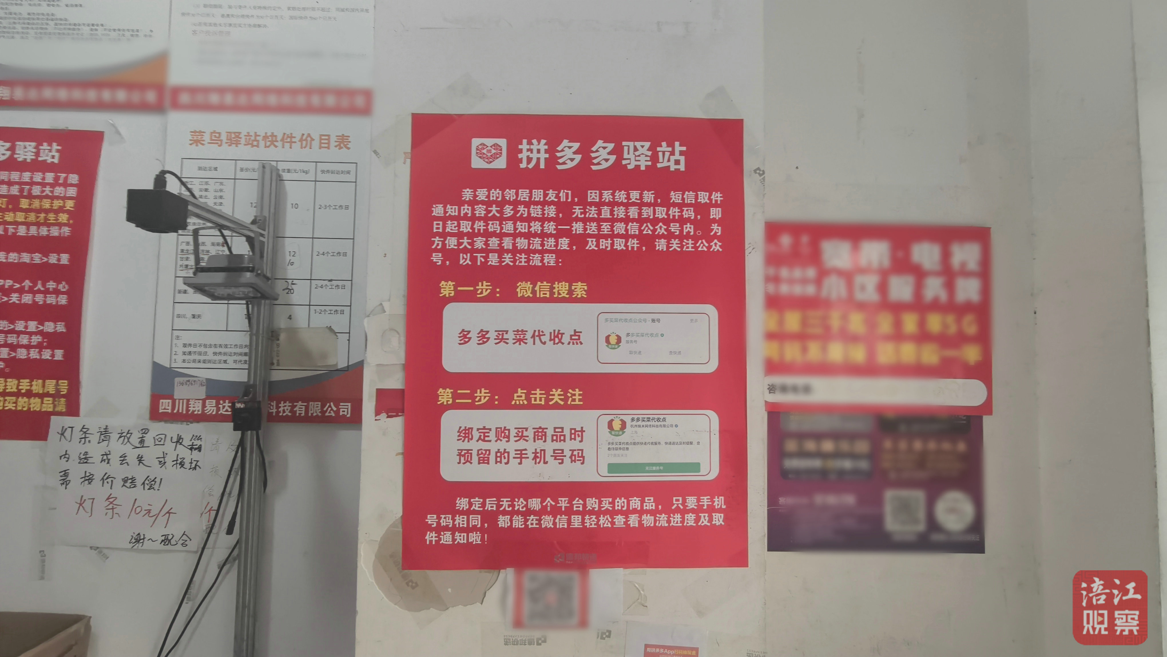 除了下載APP外,也有驛站引導(dǎo)用戶關(guān)注微信公眾號。在江油市濱江華城快遞驛站內(nèi),記者看到市民需先微信關(guān)注“多多買菜代收點(diǎn)”,綁定購買商品時(shí)預(yù)留的手機(jī)號碼后,也能獲得所有取件碼。