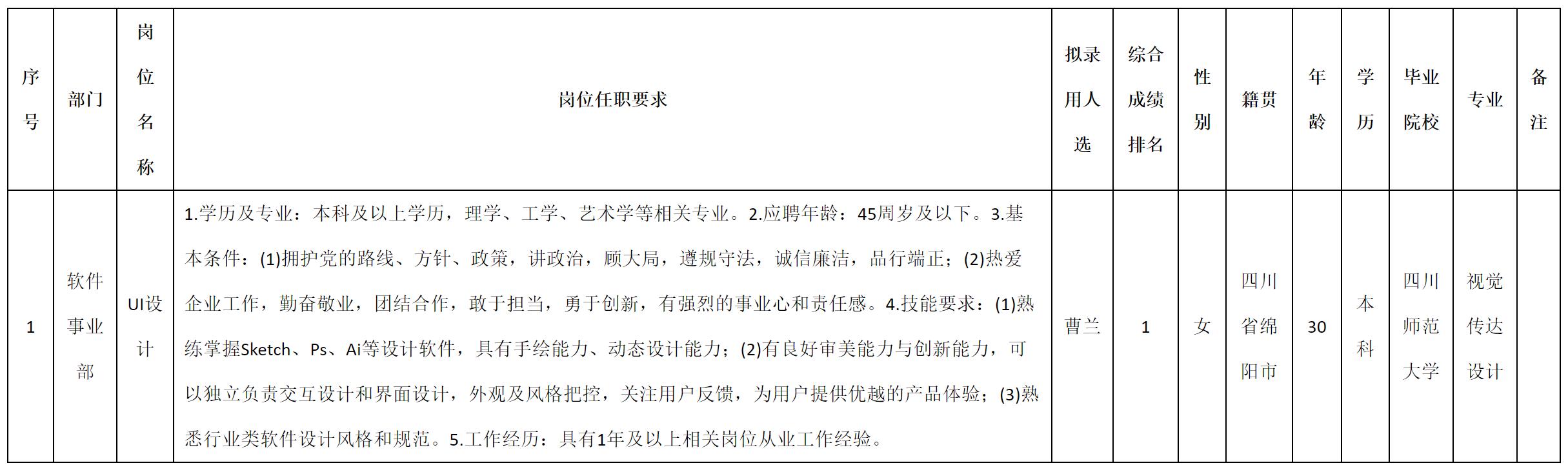根據(jù)四川九強通信科技有限公司發(fā)布的招聘公告及招聘相關(guān)規(guī)定,經(jīng)測試、考察、體檢等程序,擬錄用曹蘭同志到四川九強通信科技有限公司工作,現(xiàn)予以公示,具體情況如下: