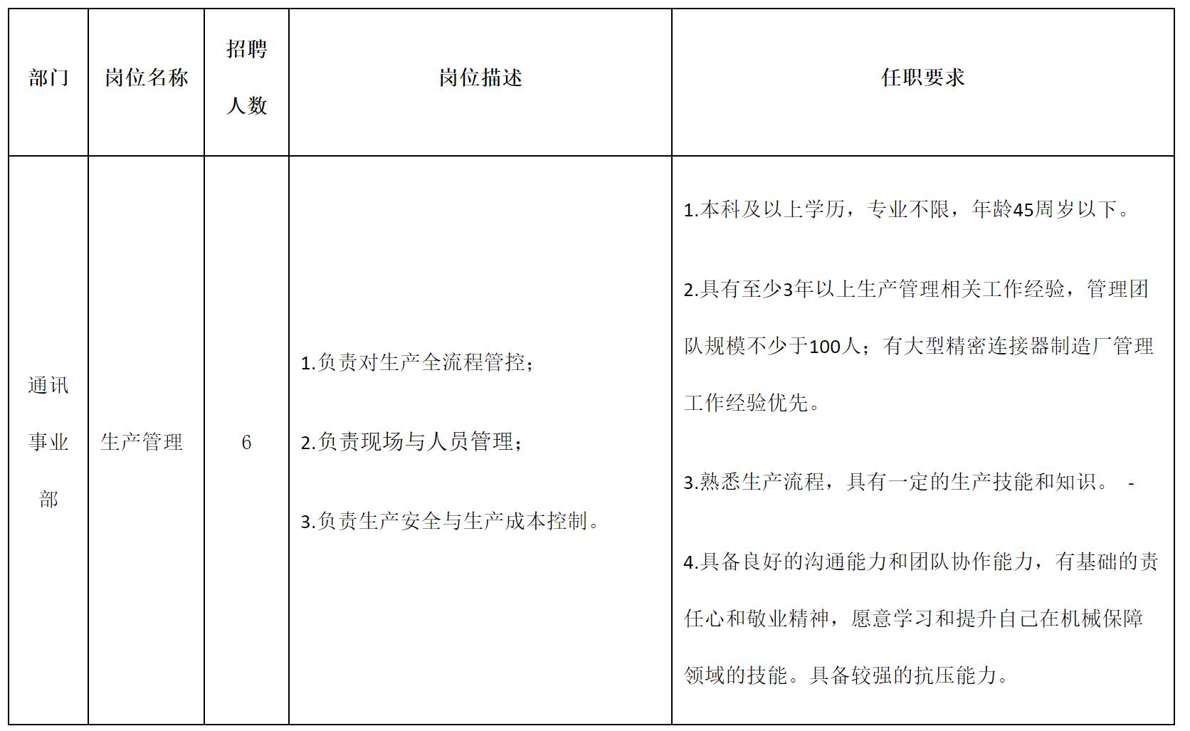 現(xiàn)因公司經(jīng)營發(fā)展需要,現(xiàn)面向長虹控股集團內(nèi)、外部誠聘生產(chǎn)管理崗位人員,具體崗位招聘信息公告如下:
