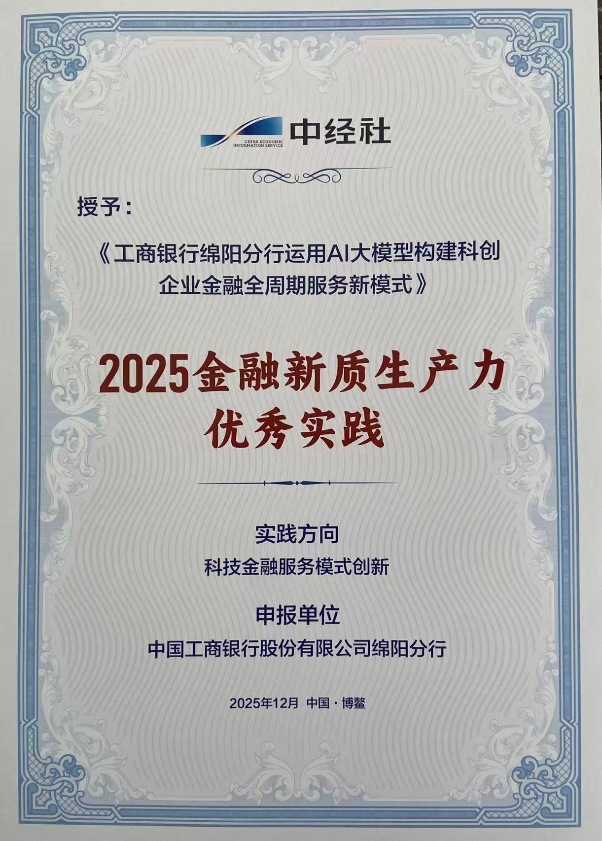 12月4日,在2025企業(yè)家博鰲論壇重要活動(dòng)中,工商銀行綿陽(yáng)分行《運(yùn)用AI大模型構(gòu)建科創(chuàng)企業(yè)金融全周期服務(wù)新模式》實(shí)踐案例,被授予“2025金融新質(zhì)生產(chǎn)力優(yōu)秀實(shí)踐”獎(jiǎng)項(xiàng)。