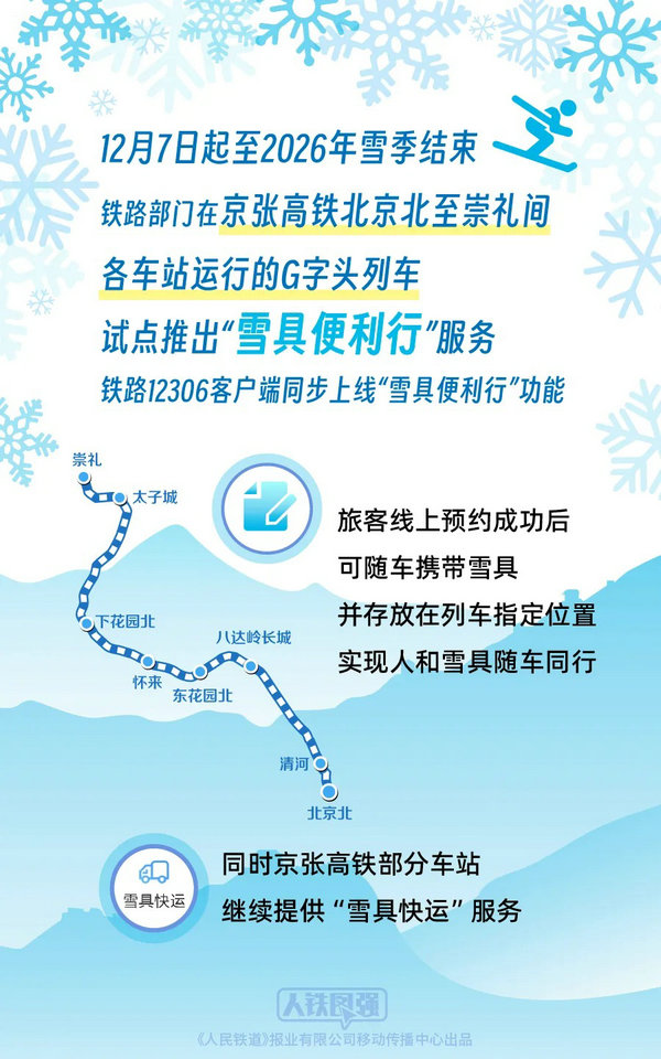 12月7日起至2026年雪季結(jié)束,鐵路部門在京張高鐵北京北至崇禮間各車站運(yùn)行的G字頭列車試點(diǎn)推出“雪具便利行”服務(wù),鐵路12306客戶端同步上線“雪具便利行”功能,旅客線上預(yù)約成功后可隨車攜帶雪具并存放在列車指定位置,實(shí)現(xiàn)人和雪具隨車同行,同時京張高鐵部分車站繼續(xù)提供“雪具快運(yùn)”服務(wù),“坐著高鐵去滑雪”將更加方便快捷。