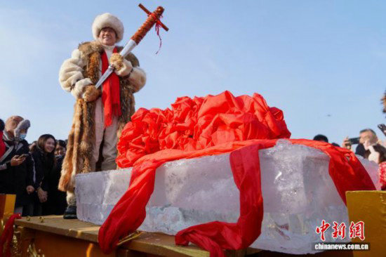 采冰節(jié)是“冰城”哈爾濱冬季伊始的盛大節(jié)日。當(dāng)?shù)夭杀幕瘹v史悠久,金代皇帝完顏亮在哈爾濱地區(qū)首次舉辦冰燈游會(huì),開啟當(dāng)?shù)乇┪幕南群?,后衍生為采冰?jié)。按傳統(tǒng)習(xí)俗,采冰漢子會(huì)在出征前喊出采冰號(hào)子,并將采出的第一塊冰材稱為“頭冰”,為其系上紅綢稱為“系鴻運(yùn)”,寓意祛病消災(zāi)、風(fēng)調(diào)雨順。