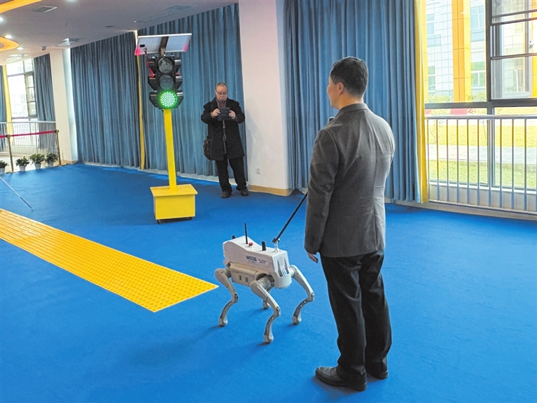 智能機(jī)器導(dǎo)盲犬為視障人士帶路演示。